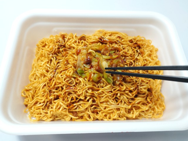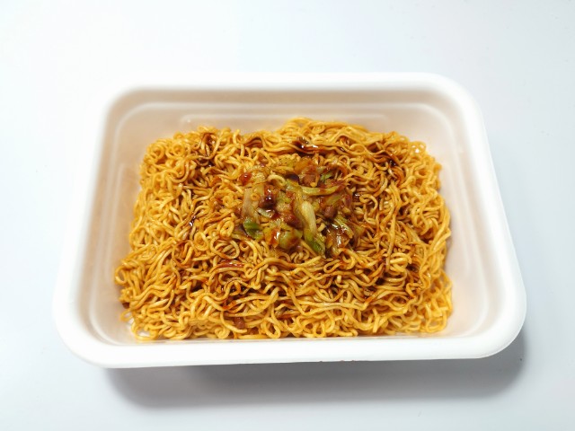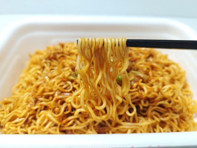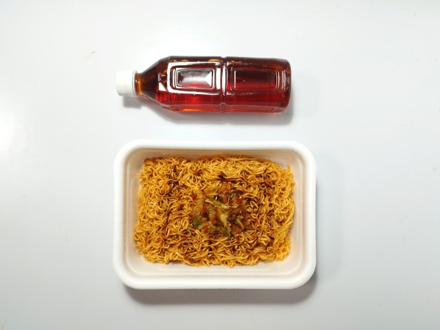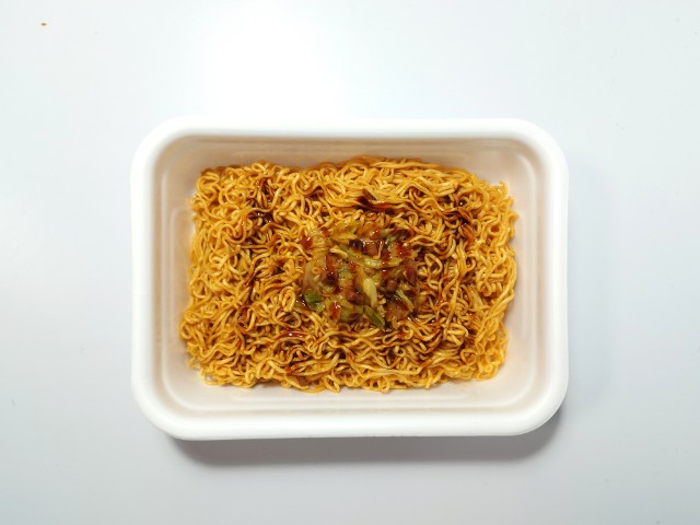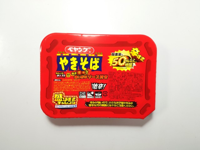 ペヤングの激辛やきそばです。ローソンでは1月27日より「盛りすぎチャレンジ」を開催していて、今回の商品も対象商品の一つになっています。内容としては麺重量がお値段そのまま50%以上増量(従来品との比較)になっているらしいです。そんな激辛焼きそばですが、しっかりとした辛味の中に醤油の風味と豚の旨味があって、ハマってしまう美味しさです。辛さの感覚と大盛の基準は個人差があるので、一概には言えませんが、食べ始めは他の味も楽しめる辛さといった感じですが、食べ進めるたびにどんどんと辛味が強くなっていく印象です。汗も止まらなくなるレベルの辛さですが、一定のラインまでいくとその辛味にも慣れていきます。もちろん辛いのが苦手な方は注意して食べるか、止めておいた方が無難だと思います。今回は撮影の為に先に追いかけ激辛ソースを入れましたが、かなり辛くなるので、少しずつ入れながら様子見していく事をオススメします。内容量は麺重量が50%以上増量というだけあって、ガッツリ食べたい方にはピッタリだと思います。ぜひ50%増量の激辛やきそばを食べてみてください。