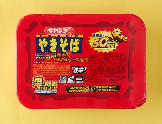 ペヤング「激辛やきそば」から麺重量を50%以上増量しました。追いがけ激辛ソース付。