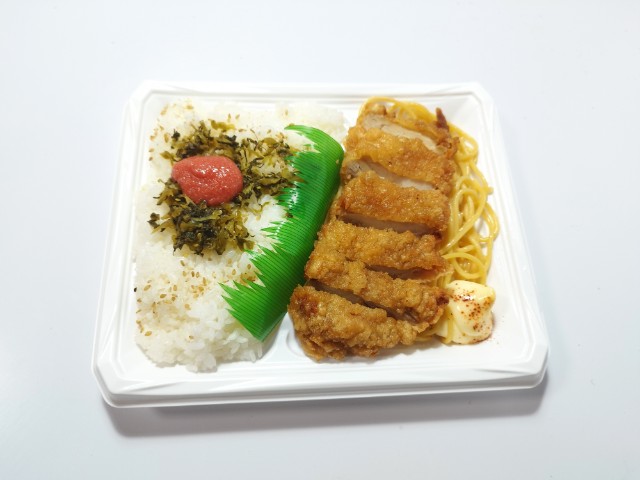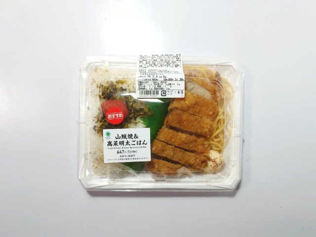山賊焼と高菜明太のお弁当です。山賊焼と高菜明太ごはんの組み合わせに惹かれて買ってみました。そんな山賊焼&高菜明太ごはんですが、山賊焼はジューシーな鶏肉と醤油の味わい、にんにくの風味があって、ご飯が進む一品になっています。高菜明太ごはんは高菜の塩味と明太子のピリッとした辛味で、間違いのない美味しさです。他にもマヨネーズや和風スパゲティがついているので、最後のひと口まで飽きることなく食べられます。内容量は1食分にちょうどよく、お腹も満たされます。ぜひ山賊焼&高菜明太ごはんを食べてみてください。