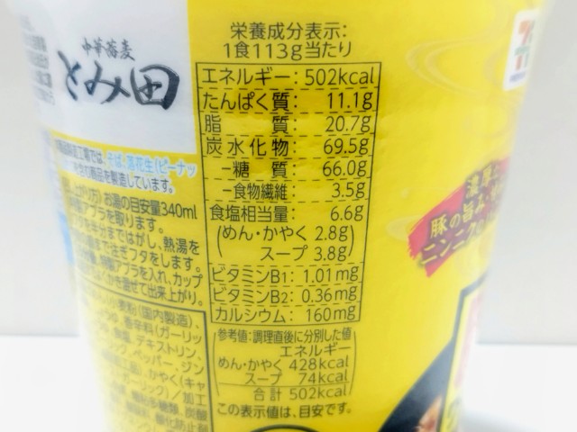 熱量:502kcal、たんぱく質:11.1g、脂質:20.7g、炭水化物:69.5g(糖質:66.0g、食物繊維:3.5g)、食塩相当量:6.6g