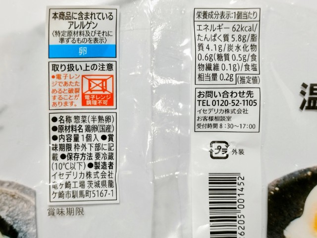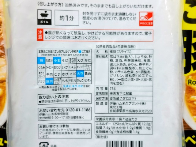 熱量:125kcal、たんぱく質:12.8g、脂質:7.4g、炭水化物:1.9g(糖質:1.9g、食物繊維:0.0g)、食塩相当量:1.4g
