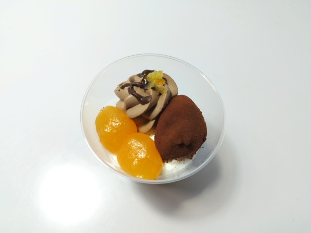 オレンジ葛ゼリー,チョコムース,ミルクムースの上に、チョコ餅,オレンジわらび餅,チョコクリーム,チョコソース,オレンジピールを盛り付けたパフェです。