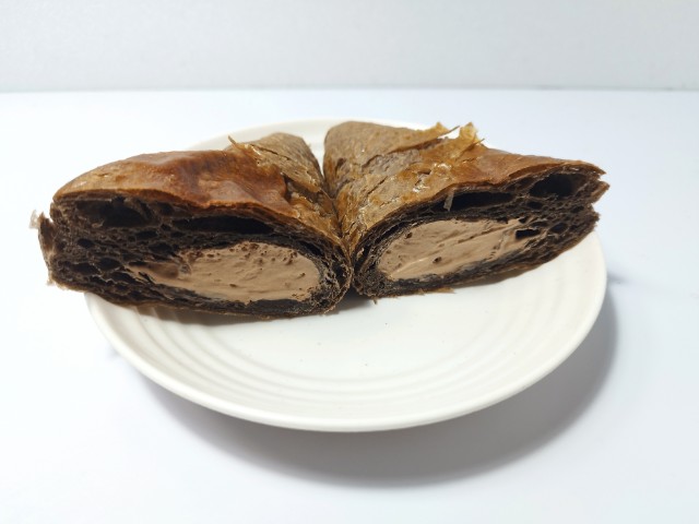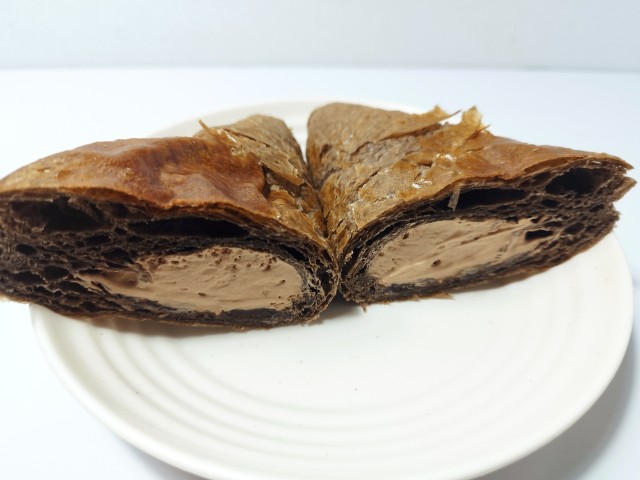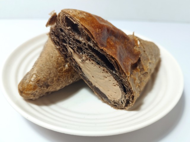 チョコチップチョコホイップが入った三角パイです。以前に三角チョコクリームパイ(2025年1月1月14日発売)がありましたが、今回はチョコホイップになっています。そんな三角チョコホイップパイですが、生地しっとりとした食感ココアの風味で、安定の美味しさです。生地の中にはチョコホイップチョコチップが入っていて、チョコホイップなめらかな食感チョコの風味チョコチップカリカリとした食感チョコの甘味を楽しむ事が出来ます。生地チョコホイップチョコチップのバランスが良いので、最後のひと口まで飽きることなく食べられます。大きさは普通の菓子パンサイズで、おやつ小腹が空いた時にピッタリです。ぜひ三角チョコホイップパイを食べてみてください。