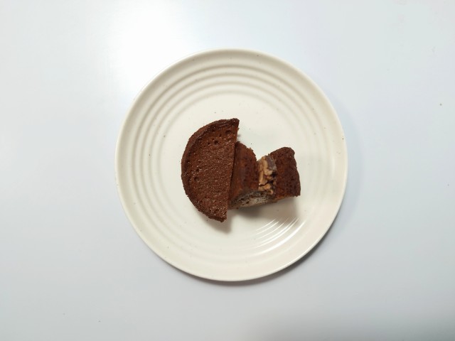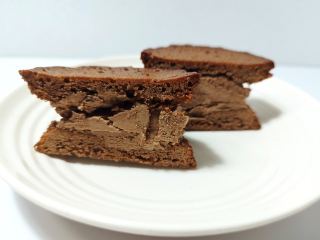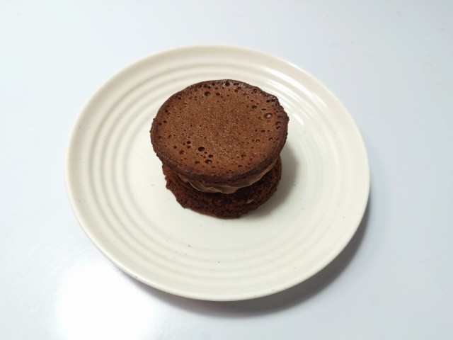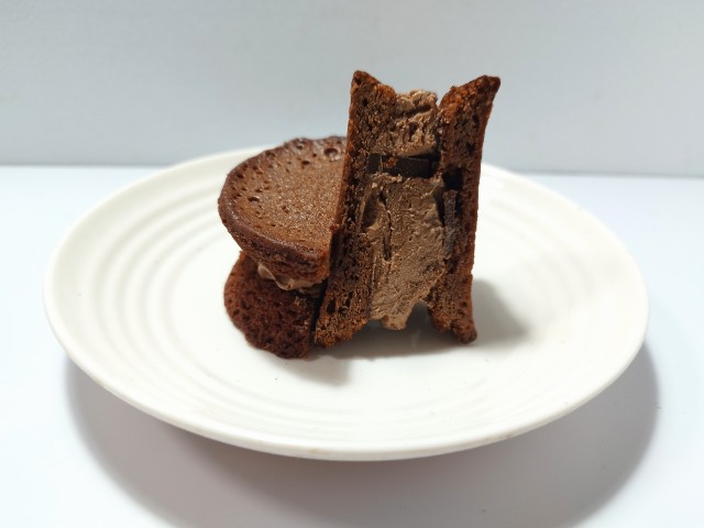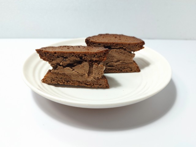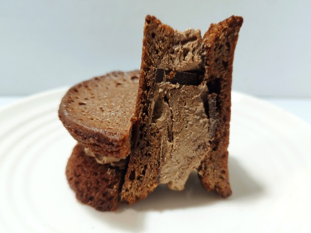 チョコクリームとチョコプレートを挟んだチョコブラウニーサンドです。見つけた瞬間に手に取ってしまった商品で、個人的には楽しみにしていた新商品の一つでもあります。そんなチョコブラウニーサンドですが、チョコブラウニー生地はサクサクとした食感とココアの風味で、これだけでも美味しく食べ進められます。間にはチョコクリームとチョコプレートが挟まっていて、チョコクリームはなめらかな食感とミルクチョコの風味、小さな長方形のチョコチップのようなチョコプレートはパリパリとした食感とチョコの甘味で、美味しいのひと言です。全体的にはチョコの味わいとチョコプレートの食感を楽しめるスイーツといった感じで、甘さがしつこくないのもポイントが高いと思います。大きさは手のひらサイズくらいで、おやつや食後のデザートにオススメです。ぜひチョコブラウニーサンドを食べてみてください。