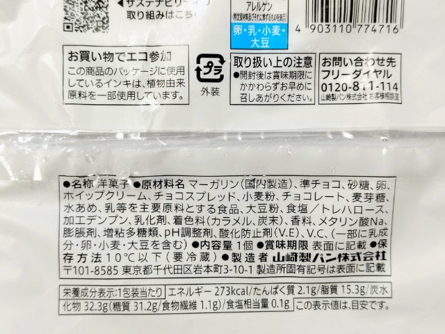 熱量:273kcal、たんぱく質:2.1g、脂質:15.3g、炭水化物:32.3g(糖質:31.2g、食物繊維:1.1g)、食塩相当量:0.1g