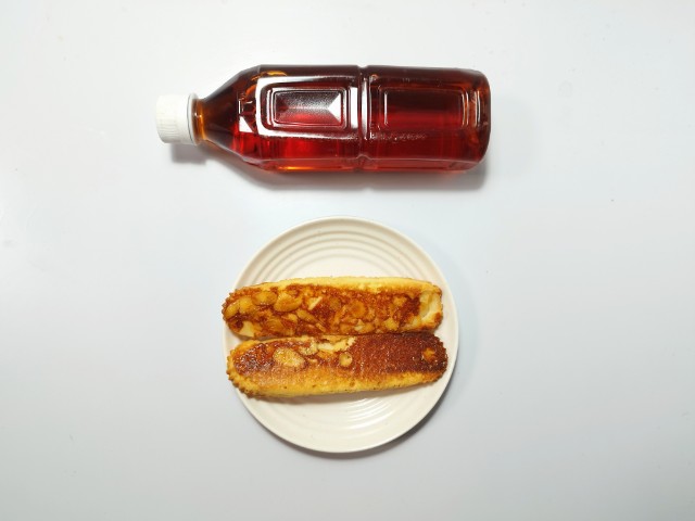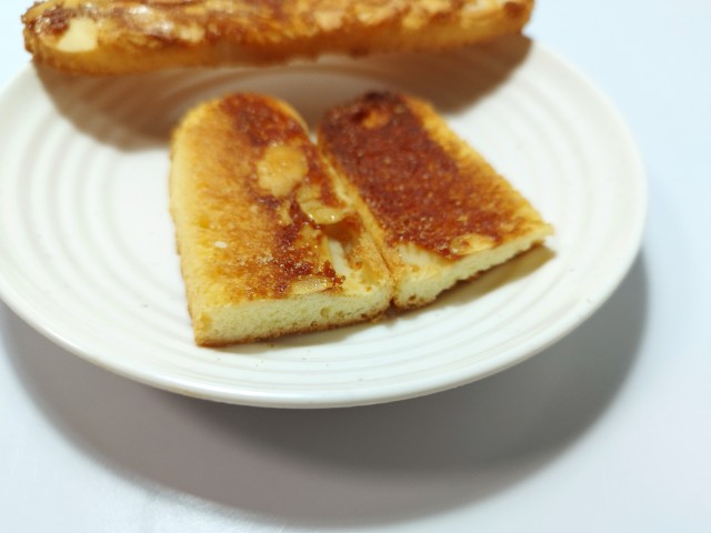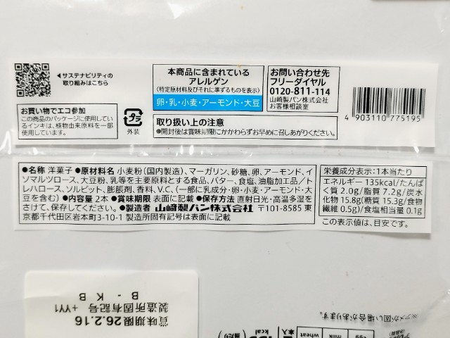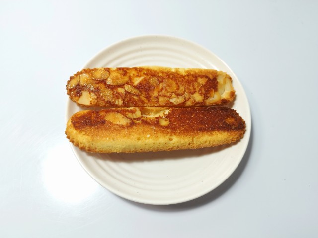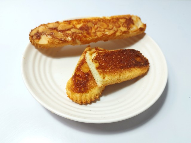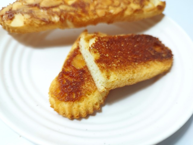 アーモンドクロッカンです。ベーカリーコーナーに置かれていた商品で、新発売のシールにつられて買ってしまいました。ちなみにクロッカンをネットで調べたところ、フランス語で「カリカリッとした」という意味で、その名の通りクロワッサン生地やデニッシュ生地などを細かくカットし、ナッツや砂糖、キャラメルなどと一緒に焼き上げたパンまたは焼き菓子だそうです。そんなアーモンドクロッカンですが、表面は飴掛けとアーモンドがトッピングがされていて、カリッとした食感とアーモンドの味わいを楽しむ事が出来ます。中のクッキー生地はサクサクとした食感とバターの風味、生地の香ばしさがあって、飴生地とのバランスも良いです。2本入で、1本はふた口サイズくらいなので、一人でも普通に食べ切れます。ぜひアーモンドクロッカンを食べてみてください。
