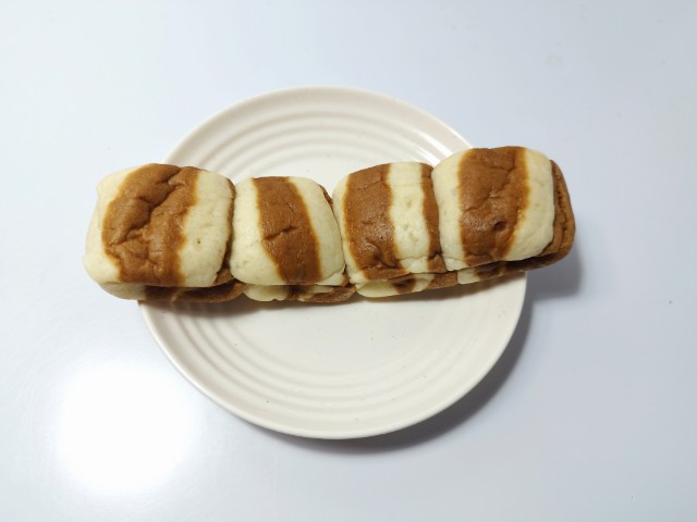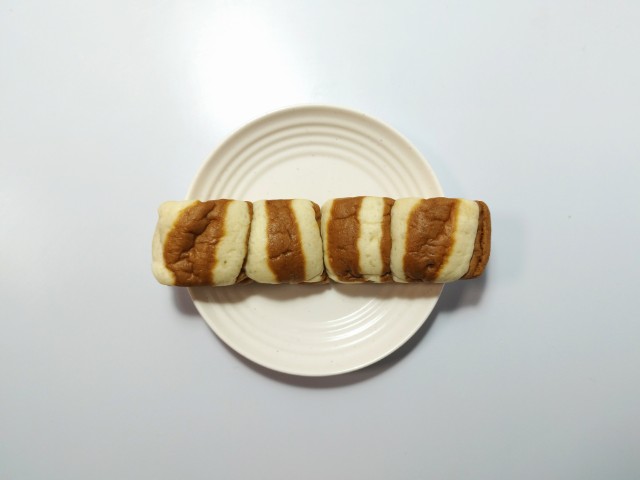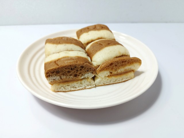 ミルク風味の生地とキャラメル風味の生地でしましま模様のしっぽに見立てたパンに、キャラメルクリームをサンドしたちぎって食べやすいパンです。パッケージは「mofusand」とコラボレーションしたデザインで、全2種類です。※沖縄県では仕様と価格が異なります。