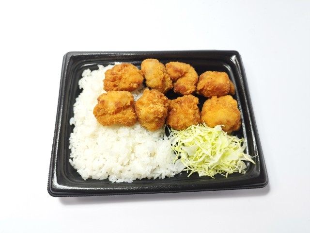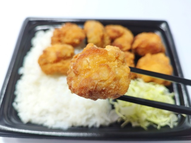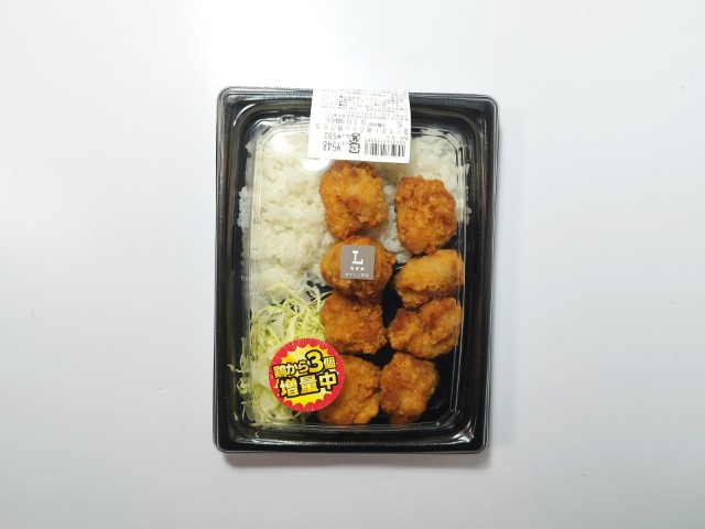 まちかど厨房の盛りすぎ!鶏のから揚げ弁当です。ローソンでは1月27日より「盛りすぎチャレンジ」を開催していて、今回の商品も対象商品の一つになっています。内容としては鶏のから揚げの個数がお値段そのまま50%増量(従来品との比較)の3個増量になっているらしいです。そんな鶏のから揚げ弁当ですが、鶏のから揚げは鶏肉のジューシーな味わいとにんにく醤油の香ばしさで、ご飯が進む一品になっています。ご飯はふんわりとした食感とお米の甘味があって、店炊きならではの美味しさがあります。他にもキャベツの千切りがのっていて、箸休めにちょうど良いです。今回はそのまま食べましたが、マヨネーズやレモンといった調味料で味変しながら食べても美味しいと思います。内容量は1食分にちょうどよく、お腹も満たされます。ぜひ盛りすぎ!鶏のから揚げ弁当を食べてみてください。