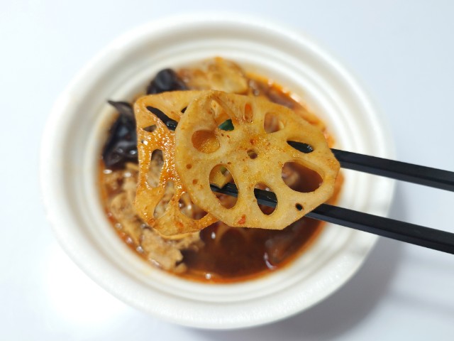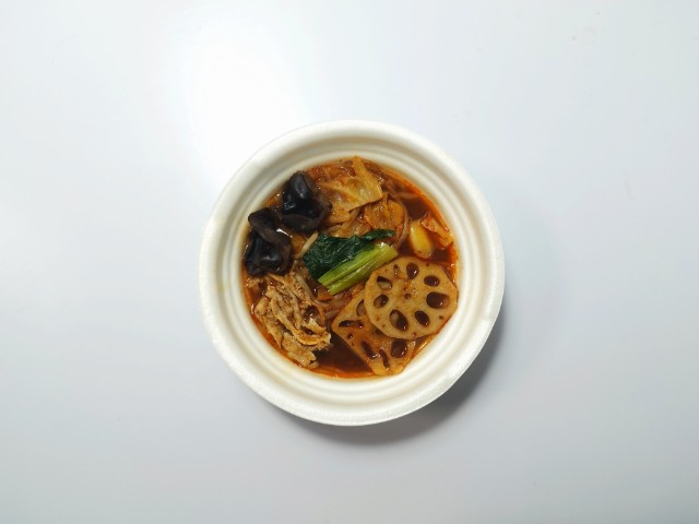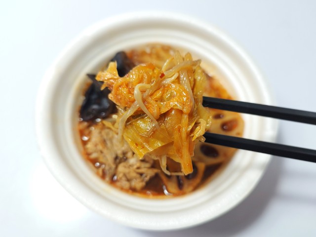 太麺春雨を使った麻辣湯です。以前にちゅるもち麻辣湯麺(2026年1月28日発売)がありましたが、こちらはスープがメインの商品になっています。そんな麻辣湯ですが、スープは豆板醤の旨味と唐辛子の辛味、花椒の香りがあって、ハマってしまう美味しさです。やはり気になるのは辛味ですが、口に入れた瞬間にビリビリとした辛味がやってきますが、後に辛味が残らないので、かなり食べやすい麻辣湯だと思います。具材には太麺春雨を始め、白菜、もやし、キャベツ、きくらげ、豚肉など色々と入っているので、最後のひと口まで飽きることなく食べられます。今回はこのまま食べましたが、お腹に余裕があれば、ご飯と合わせてもイケると思います。内容量は一人分にちょうどよく、ご飯のおかずやお酒のお供にピッタリです。ぜひ麻辣湯を食べてみてください。