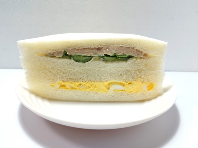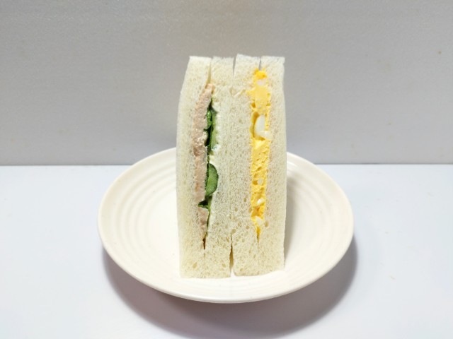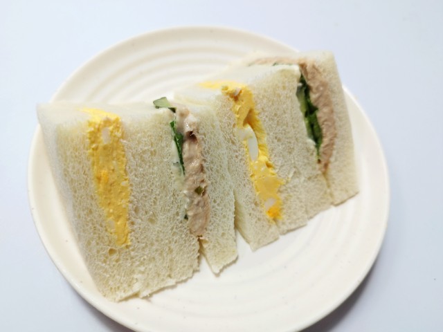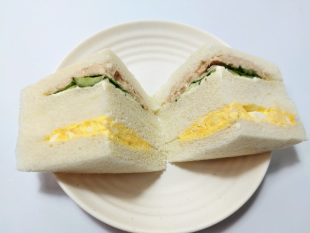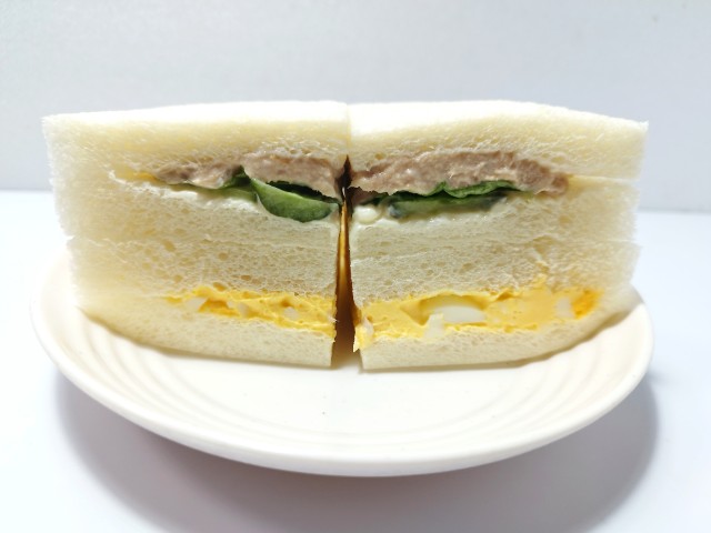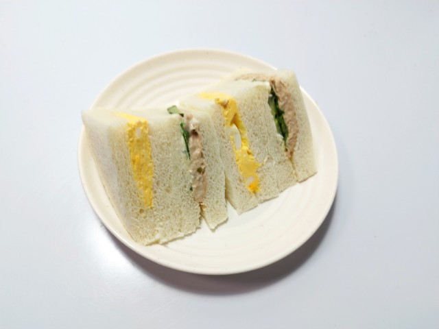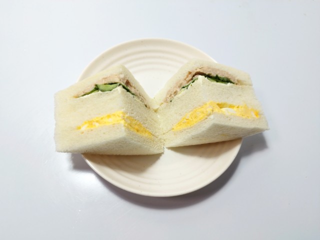 ツナときゅうりの組とたまごの組を合わせたサンドイッチです。
