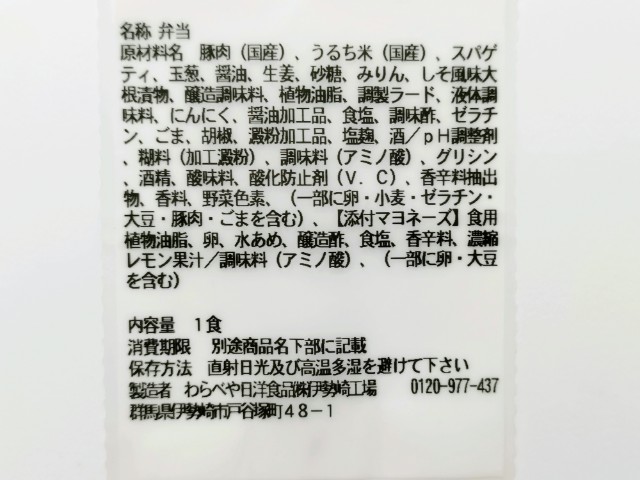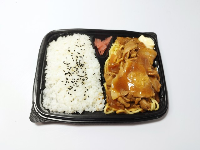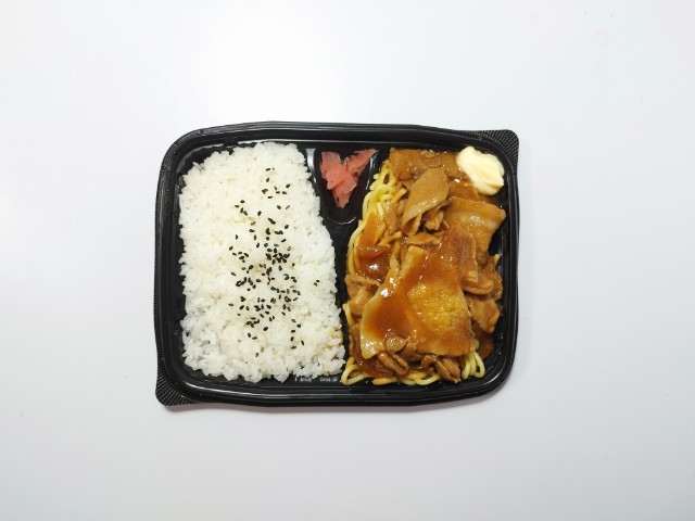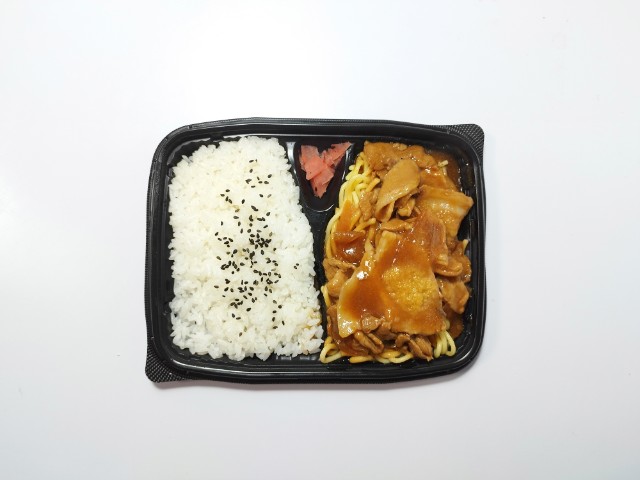 豚の生姜焼きのお弁当です。シンプルながらその見た目に惹かれて買ってみました。そんな豚生姜焼き弁当ですが、豚の生姜焼きはジューシーな豚肉と生姜の風味、甘辛いタレの味わいがあって、ご飯が進む一品になっています。特に豚肉の大きさと柔らかい肉質は味だけでなく、食べ応えもしっかりとあるので、満足度も高いと思います。ポイントは別添のマヨネーズで、マヨネーズの酸味となめらかな味わいが加わる事で、また違った生姜焼きの美味しさを楽しむ事が出来ます。生姜焼きの他にも漬物やスパゲティがありますが、こちらは箸休めといった感じだと思います。内容量は1食分にちょうどよく、お腹も満たされます。ぜひ豚生姜焼き弁当を食べてみてください。