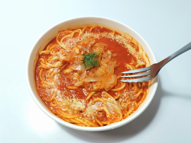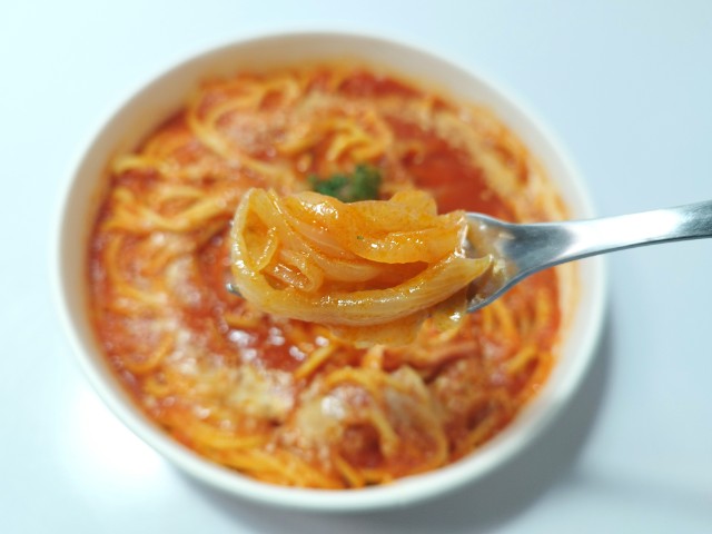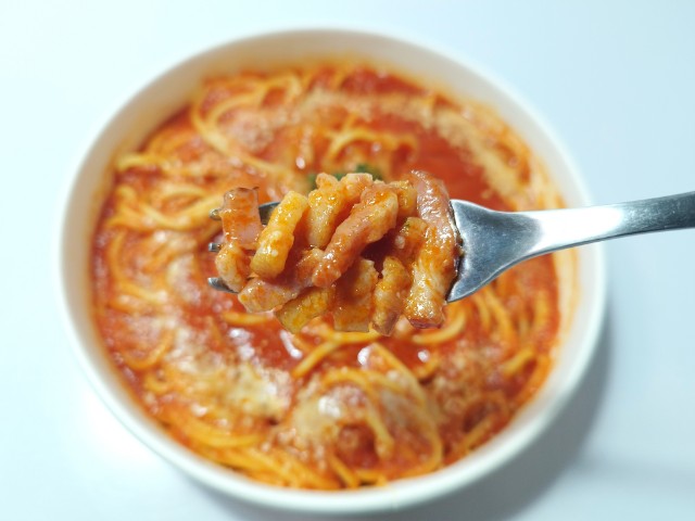 デルモンテ リコピンリッチトマトピューレを使ったトマトベースのパスタです。以前の購入が2026年2月10日発売だったので、約1ヶ月近く経っていますが、価格は変わっていません。今回は販売地域の変更にて再販されたといった感じで、今後も同様に色々な地域で発売されるのかもしれません。ちなみにアマトリチャーナをネットで調べたところ、イタリアの首都ローマがあるラツィオ州を代表する、トマトソースベースの伝統的なパスタ料理だそうです。そんなトマトとベーコンのアマトリチャーナですが、パスタソースはトマトの酸味とベーコンの旨味、野菜の甘味があって、ハマってしまう美味しさです。パスタはほどよい硬さと小麦の風味で、濃厚なパスタソースともよく絡みます。トッピングにはベーコンや玉ねぎ、パセリなどがのっていて、それぞれの味や食感を楽しめます。今回はそのまま食べましたが、追いチーズやタバスコを加えて、味変しながら食べても美味しいと思います。内容量は1食分にちょうどよく、お腹も満たされます。ぜひトマトとベーコンのアマトリチャーナを食べてみてください。