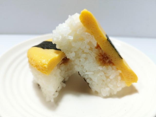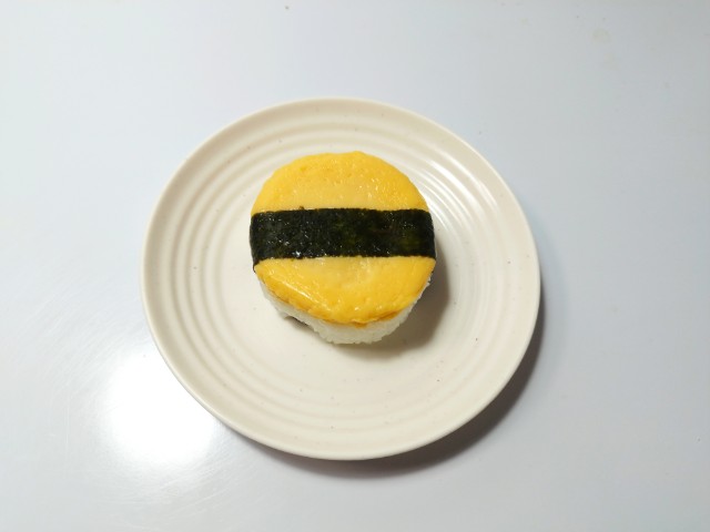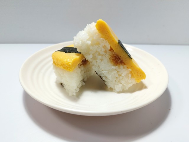 玉子焼きがのったお寿司です。以前にたまご寿司(2024年11月5日発売)がありましたが、今回は丸型になっています。そんなだし香る玉子の寿司ですが、玉子焼きはたまごの甘味とだしの旨味で、安定の美味しさです。酢飯はほどよい酸味とふっくらとした食感で、玉子焼きとの相性抜群です。また、玉子焼きと酢飯の間には醤油たれが入っているので、何もつけなくても美味しく食べられます。大きさは普通のおむすびサイズくらいで、小腹が空いた時や主食のあと一品追加したい時にピッタリです。ぜひだし香る玉子の寿司を食べてみてください。