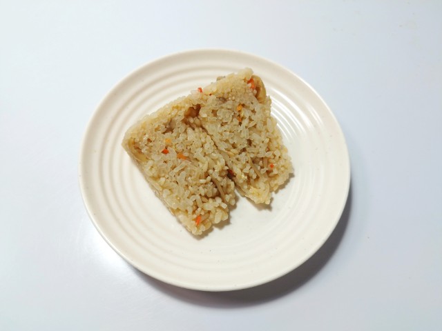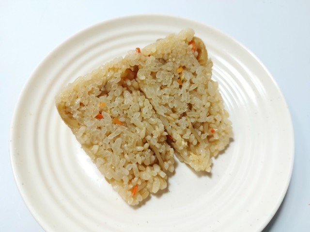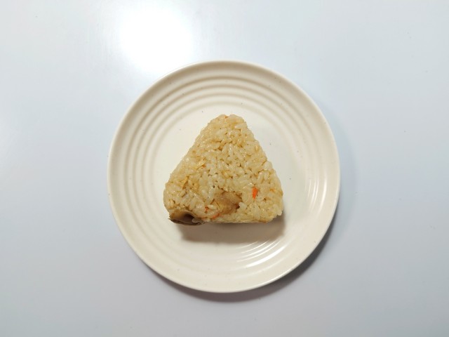 舞茸ご飯のおむすびです。シンプルながらその見た目に惹かれて買ってみました。そんな舞茸ご飯おむすびですが、ご飯はだしの旨味とふっくらとした食感で、安定の美味しさです。ご飯には舞茸や人参、油揚げが混ぜ込まれていて、だしご飯の美味しさをさらに引き立てています。また、ご飯にはマンナン米(こんにゃくを原料とした米粒状加工食品)も一部使われているようですが、全く違和感を感じません。ちなみにマンナン米は白米に混ぜて炊くだけで、糖質やカロリーをカットして、食物繊維も摂れるそうです。大きさは普通のおむすびサイズで、小腹が空いた時や主食にあと一品追加したい時にピッタリです。ぜひ舞茸ご飯おむすびを食べてみてください。