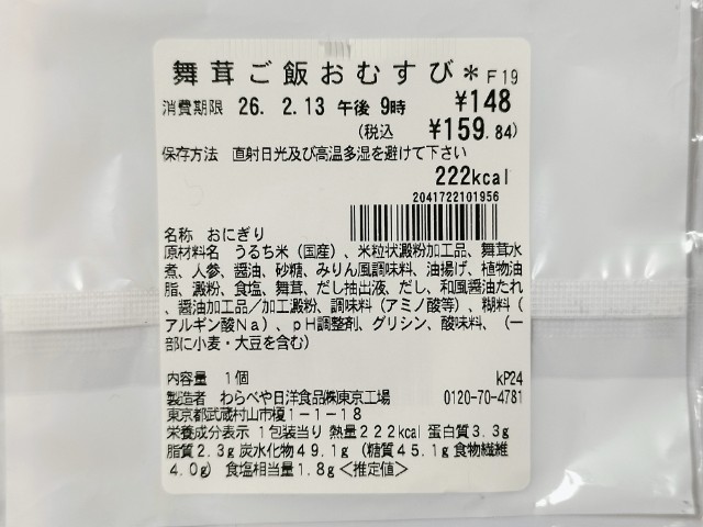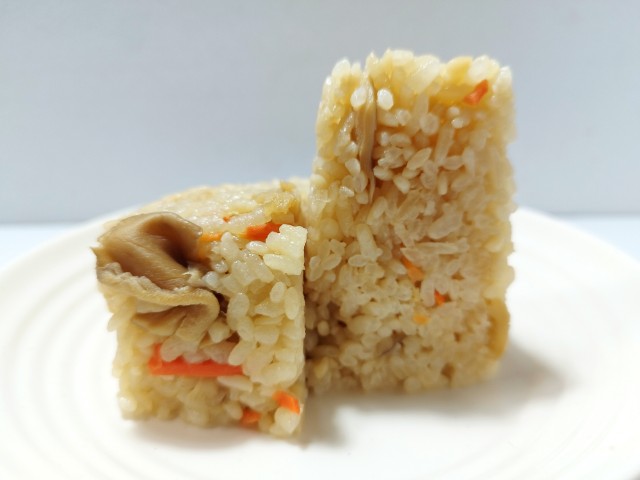 舞茸,人参,油揚げを混ぜ込んだ、混ぜ飯おむすびです。ご飯の一部にマンナン米(こんにゃくを原料とした米粒状加工食品)を使用しています。