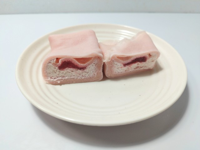 さくらといちごを使ったクレープです。見つけた瞬間に手に取ってしまった商品で、個人的に楽しみにしていた新商品の一つでもあります。そんなもっちり和クレープですが、クレープ生地はもちもちとした食感とほのかな甘味で、安定の美味しさです。ちなみに生地はピンク色ですが、さくらやいちごの風味はなく、普通のクレープ生地です。中には果肉入りいちごソースとさくら風味の餡、さくらクリームが入っていて、果肉入りいちごソースはいちごの酸味と果肉の食感で、味のアクセントになっています。さくら風味の餡はあんの甘味とさくらの風味、さくらクリームはなめらかな食感とさくらの味わいで、生地との相性も良いです。大きさは手のひらサイズより少し大きいくらいで、おやつや食後のデザートにオススメです。ぜひさくらといちごのもっちり和クレープを食べてみてください。