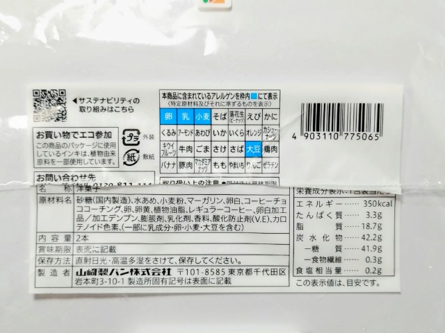 熱量:350kcal、たんぱく質:3.3g、脂質:18.7g、炭水化物:42.2g(糖質:41.9g、食物繊維:0.3g)、食塩相当量:0.2g