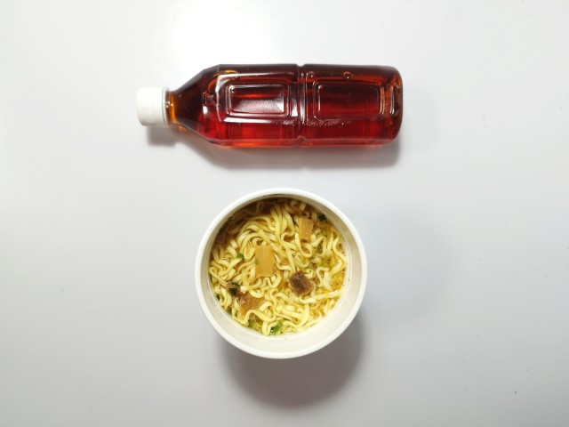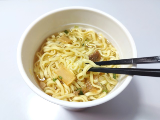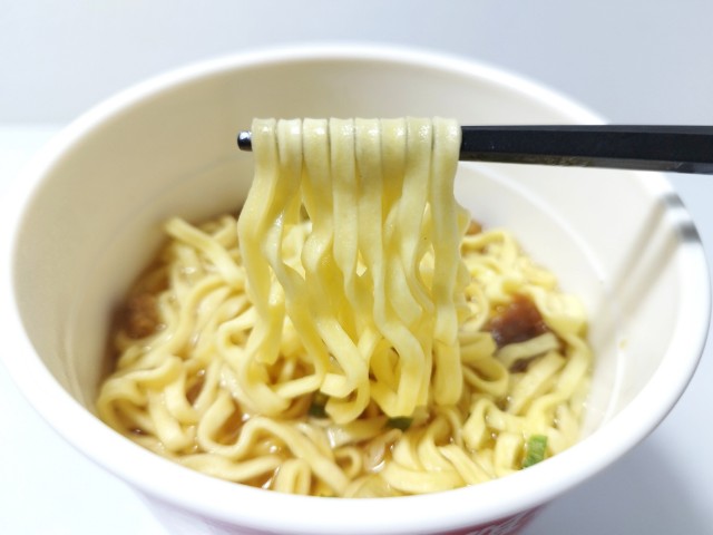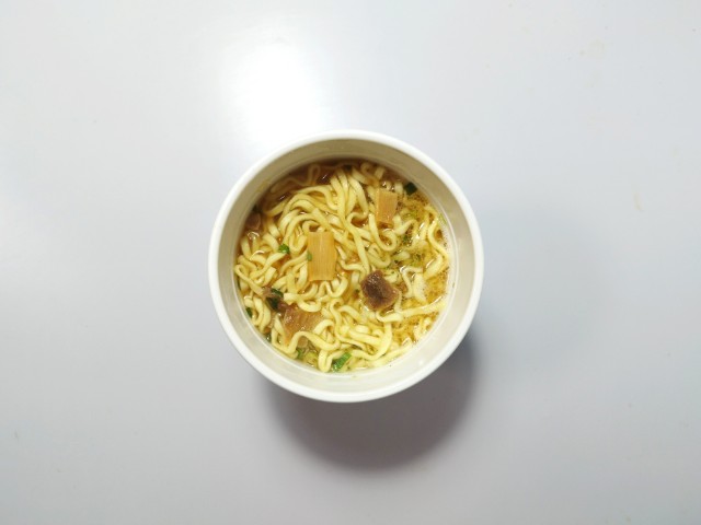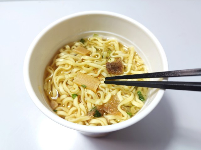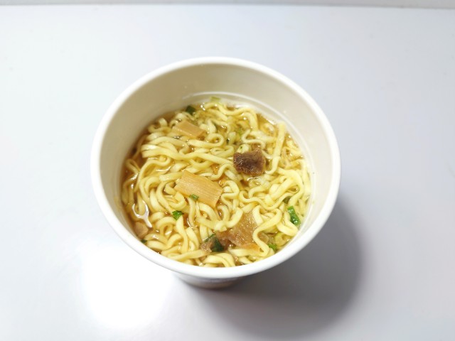 ちえちゃんラーメンの中華そばです。セブンイレブン限定のカップ麺で、熱湯を入れて5分後にフタの上に付いていた特製スープを加えて、よくかき混ぜて完成となります。ちなみにちゃん系ラーメンをネットで調べたところ、神田駅ガード下で創業した「神田ちえちゃんラーメン」がいわゆる「ちゃん系」の原点で、醤油ベースのあっさりしながらも深いコクを持つ中華そばのスタイルだそうです。そんな中華そばですが、スープは醤油の風味と豚の旨味があって、しっかりとしたコクがありつつも後味はあっさりとしています。平打ちの麺は小麦の風味と歯切れの良さで、スープとの相性抜群です。具材には味付豚肉や味付挽肉、メンマ、ねぎが入っていて、それぞれの味や食感を楽しめます。内容量は普通のカップ麺サイズで、小腹が空いた時やおにぎりやパンと合わせて1食分にするのにもオススメです。ぜひ中華そばを食べてみてください。