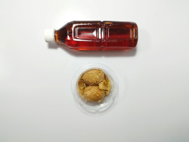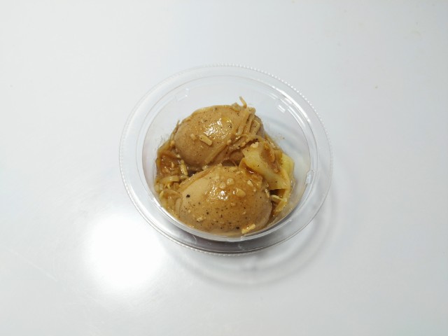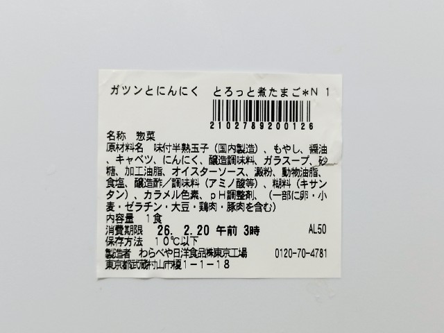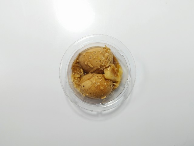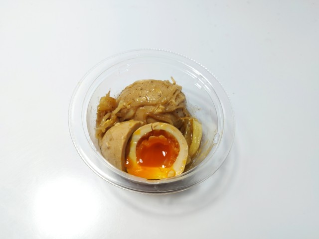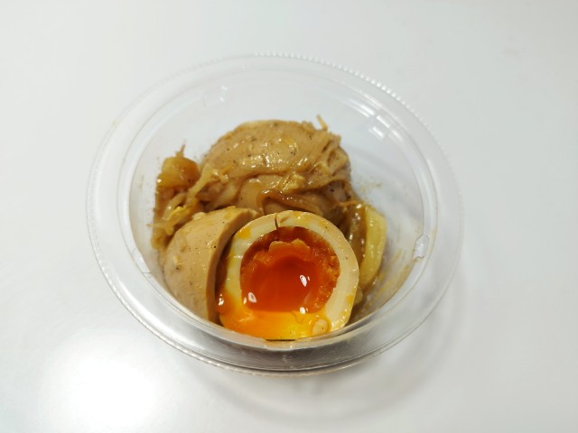 にんにくが効いた煮たまごです。パッケージのデザインやガツンとにんにくの言葉に惹かれて買ってみました。そんなとろっと煮たまごですが、白身はプルンとした食感と醤油の風味、中の卵黄はとろりとした食感と黄身のコクがあって、ハマってしまう美味しさです。そして、どちらにもしっかりとにんにくが効いていますが、特に卵黄は黄身のコクとにんにくの味わいがピッタリと合っていて、より濃厚な味わいを楽しむ事が出来ます。他にもキャベツやもやしも入っていて、にんにくと共にその食感も楽しめます。今回はそのまま食べましたが、ご飯にのせてたまごを崩して食べても、また美味しいと思います。内容量は一人分にちょうどよく、おつまみやおかずのあと一品追加にもオススメです。ぜひガツンとにんにくのとろっと醤油煮たまごを食べてみてください。