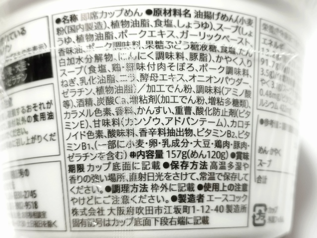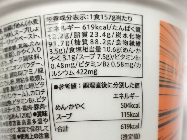 熱量:619kcal、たんぱく質:12.2g、脂質:23.4g、炭水化物:91.7g(糖質:88.2g、食物繊維:3.5g)、食塩相当量:10.6g