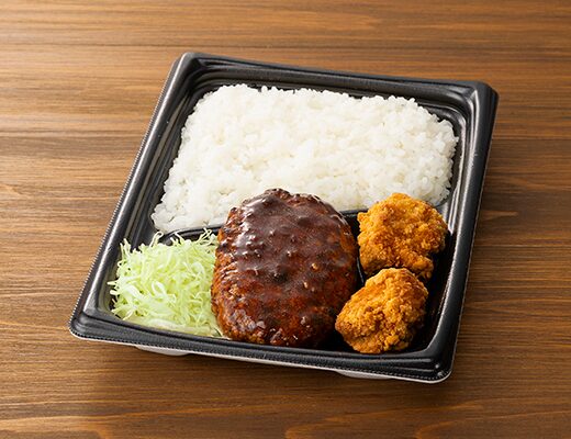 ハンバーグと鶏唐揚げを盛り合わせたお弁当です。以前にまちかど厨房 盛合せ弁当(肉野菜&鶏から)(2025年4月15日発売)がありましたが、今回はハンバーグ&鶏からになっています。そんな盛合せ弁当ですが、ハンバーグは肉の旨味と溢れる肉汁、デミグラスソースのコクがあって、ご飯が進む一品になっています。鶏唐揚げはサクッとした食感とジューシーな味わいで、間違いのない美味しさです。他にもキャベツの千切りがのっていて、箸休めにもちょうどよいです。全体的に肉系おかずのガッツリ弁当といった感じで、食べ応えがあって満足度も高いと思います。内容量は1食分にちょうどよく、お腹も満たされます。ぜひ盛合せ弁当を食べてみてください。