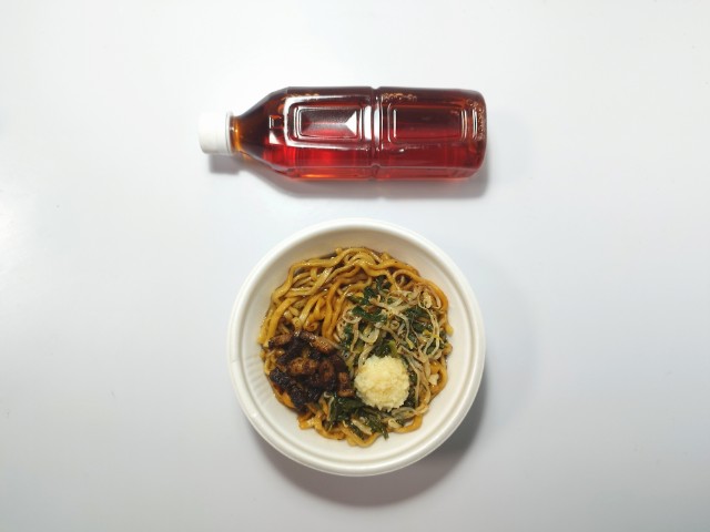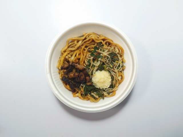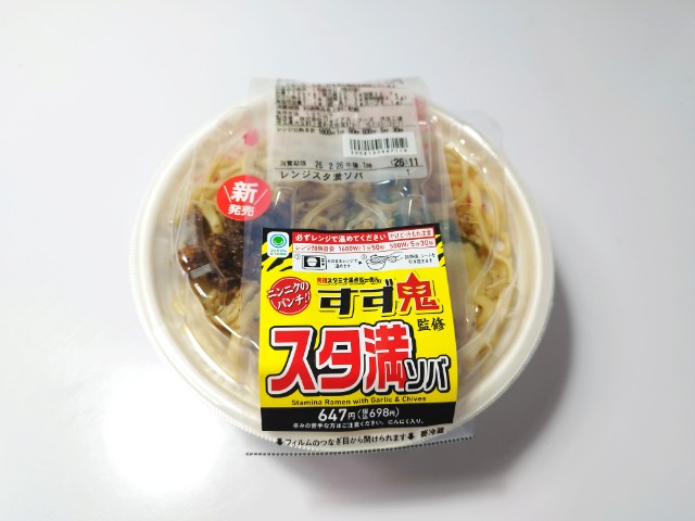 すず鬼監修のスタ満ソバです。ファミリーマートでは2月24日より全国各地をめぐる至福の「名店監修ラーメン巡り」を開催していて、今回の商品も対象商品の一つになっています。ちなみにこれまでファミリーマートのすず鬼監修商品はカップ麺や冷凍食品、スナック菓子ではよく見かけていると思いますが、今回はチルド麺として登場しています。そんなスタ満ソバですが、スープは醤油の風味とにんにくの味わい、黒胡椒のピリッとした辛味があって、濃厚ながらキレのある後味になっています。太めの麺はワシワシとした食感と小麦の風味で、食べ応え抜群です。具材には豚肉炒めを始め、にら、もやし、おろしにんにくがのっていて、それぞれの味や食感を楽しめます。特におろしにんにくはかなりのっているので、スープによく溶かすのも良いですし、そのままダイレクトににんにくの味わいを楽しむのも良いと思います。また、食べ終わった後は口の中が麻痺するレベルでにんにくが残るので、食べた後に人に会う場合はマスク着用をオススメします。内容量は1食分にちょうどよく、お腹も満たされます。ぜひスタ満ソバを食べてみてください。