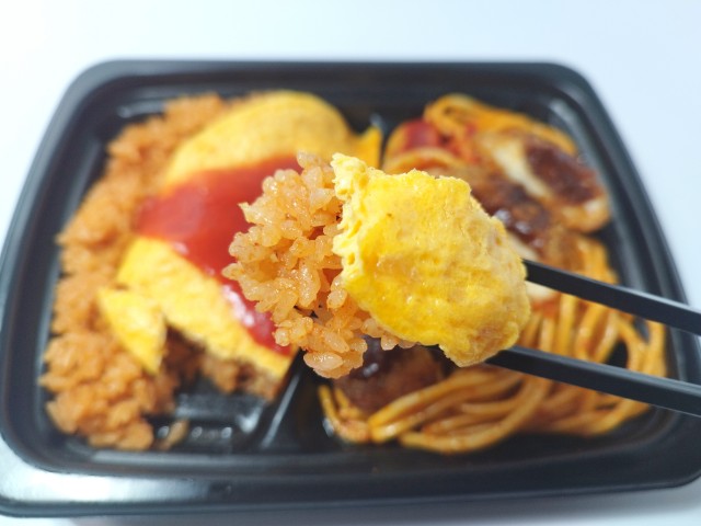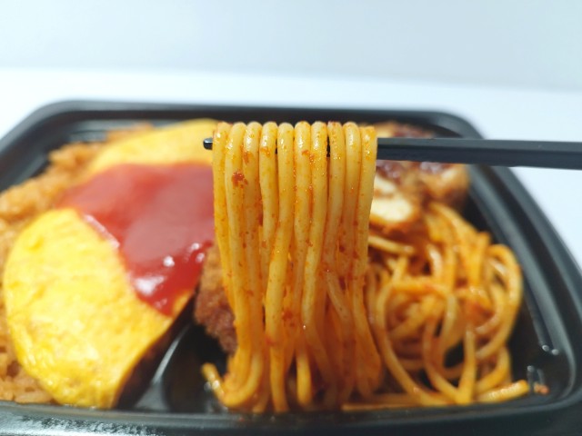 オムライスとナポリタンを同時に楽しめる商品です。よくばりセットメシも色々なものが出ていますが、今回はオムライスとナポリタンのセットになっています。また、以前によくばり合体メシ オムライス&ナポリタン(2025年3月11日発売)がありましたが、価格もカロリーも異なっていて、違うシリーズなので、今回は別物として紹介しています。そんなよくばりセットメシですが、オムライスはたまごの甘味とケチャップライスの味わい、ナポリタンはケチャップのほのかな酸味とパスタのほどよい硬さで、安定の美味しさです。トッピングにはチキンカツがのっていて、鶏の旨味としっとりと柔らかい肉質、ソースの酸味があって、オムライスにもナポリタンともよく合います。内容量は1食分にちょうどよく、お腹も満たされます。ぜひオムライス&ナポリタンのよくばりセットメシを食べてみてください。