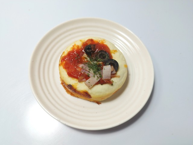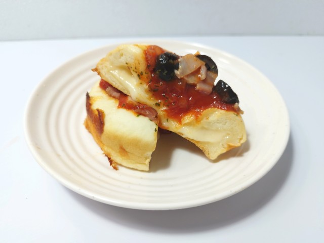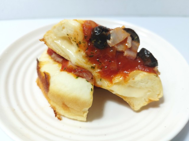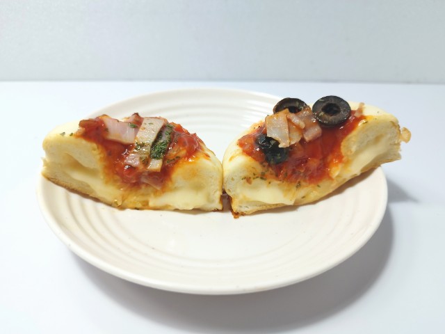 ふわもち食感の生地にたっぷりのチーズソースを包み込み、上からトマトソース、ベーコン、オリーブ、パセリをのせた商品です。