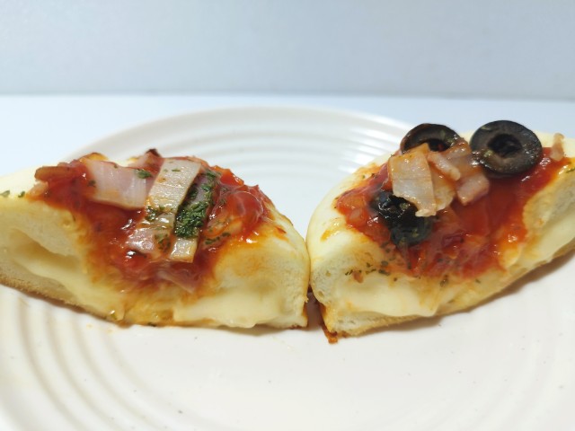 チーズソースを包んだ調理パンです。チーズに沼るの言葉に惹かれて買ってみました。そんなチーズに沼るトマト&ベーコンですが、生地はもちっとした食感と歯切れの良さで、安定の美味しさです。中にはチーズソースが入っていて、なめらかな食感とチーズのコク、ほのかな塩味があって、生地との相性抜群です。チーズ自体はクセがなくて、食べやすいのも嬉しいポイントです。トッピングにはトマトソースとベーコン、オリーブ、パセリがのっていて、味や食感のアクセントになっています。チーズが好きな方にはたまらない商品で、かなり満足度も高いと思います。大きさは普通の惣菜パンくらいで、おやつや小腹が空いた時にピッタリです。と、ここまで色々と言っておいてなんですが、今回の商品は東京都と限られてしまっているので、購入するのはちょっと厳しいかもしれません。ただ、一部店舗で販売として紹介していた商品が、翌々週の新商品としてほぼ全国で発売となったりしているので、この商品ももしかしたら同様に販売されるかもしれません。まだまだ、その地域のセブンイレブンでしか買えない商品はたくさんあって、皆さんの地域にもあると思います。今回の商品もこんな商品を売っているんだ的な感覚で見てもらって、高そうや美味しくなさそうといった見方や、ご自身の地域でしかない商品の比較などにしてもらえたら嬉しく思います。と言っているのに申し訳ないですが、締めの言葉は必要ですので最後に、ぜひをチーズに沼るトマト&ベーコン食べてみてください。
