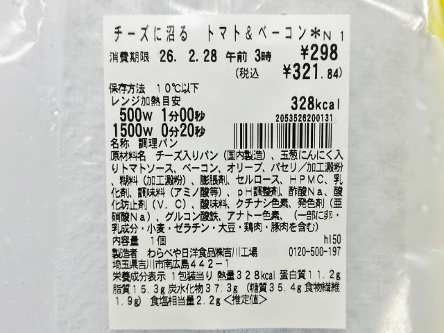 熱量:328kcal、たんぱく質:11.2g、脂質:15.3g、炭水化物:37.3g(糖質:35.4g、食物繊維:1.9g)、食塩相当量:2.2g