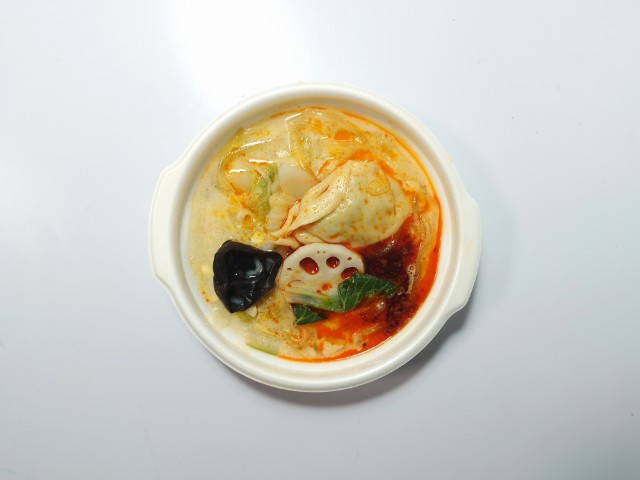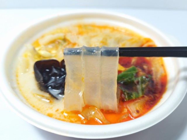 牛骨、牛白湯ベースのコクのあるスープに、花椒の香りや油辣椒(ユラージャオ)が入ることで濃厚さと辛さがマッチ。つるもち食感の太麺春雨を使用。