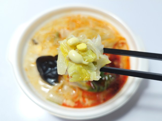 太麺春雨を使った麻辣白湯です。以前につるもち太麺春雨 麻辣湯(2026年2月10日発売)がありましたが、今回は白湯スープを掛け合わせてあります。そんな麻辣白湯ですが、スープは牛の旨味と唐辛子の辛味、花椒の香りがあって、やみつきになってしまう美味しさです。辛味においては白湯スープが加わった事で、かなり抑えられていますが、それでも後からピリピリとした辛味はやってきます。具材には太麺春雨を始め、白菜、もやし、キャベツ、きくらげ、餃子など色々と入っているので、最後のひと口まで飽きることなく食べられます。内容量は一人分にちょうどよく、ご飯のおかずやお酒のお供にピッタリです。ぜひ麻辣白湯を食べてみてください。