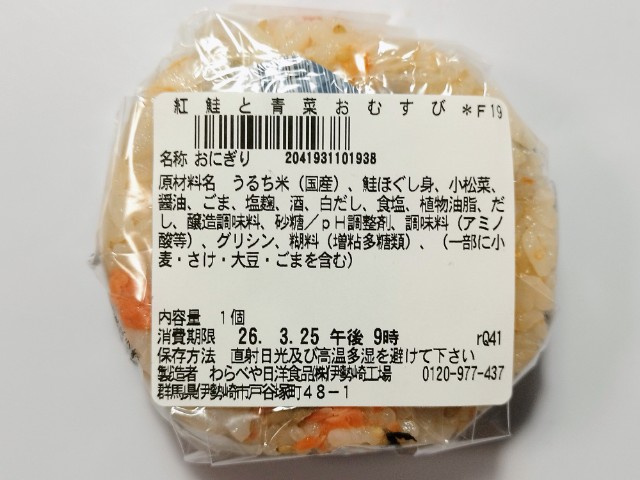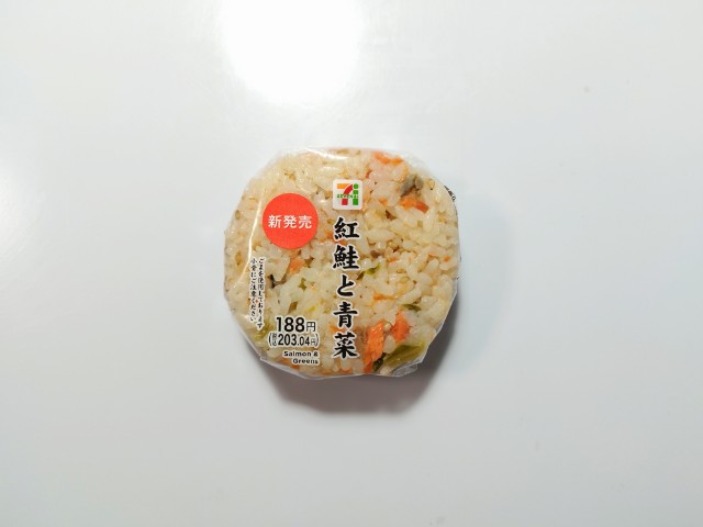 鮭のほぐし身と小松菜、ごまを使ったおむすびです。以前の購入が2026年2月24日発売だったので、約1ヶ月近く経っていますが、価格は変わっていません。今回は販売地域の変更にて再販されたといった感じで、今後も同様に色々な地域で発売されるのかもしれません。そんな紅鮭と青菜おむすびですが、鮭のほぐし身と小松菜が混ぜ込まれただしご飯は、だしの旨味と鮭の塩味、小松菜の味わいで、間違いのない美味しさです。また、一緒に混ぜ込まれているごまの食感と風味がアクセントになっていて、最後のひと口まで美味しく食べられます。大きさは普通のおむすびサイズで、小腹が空いた時や主食にあと一品追加したい時にピッタリです。ぜひ紅鮭と青菜おむすびを食べてみてください。