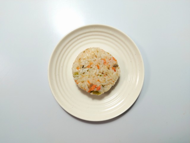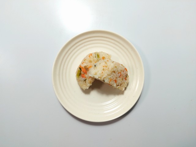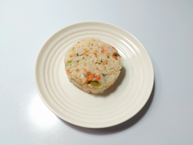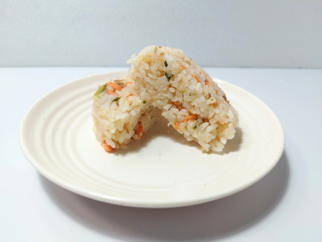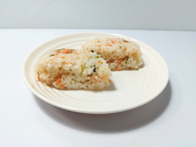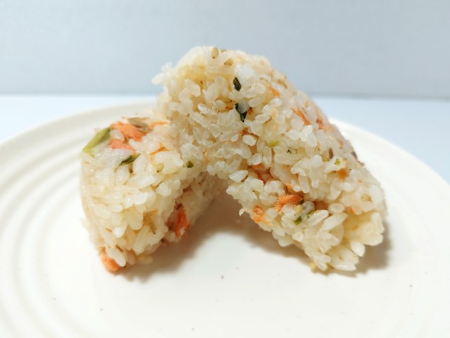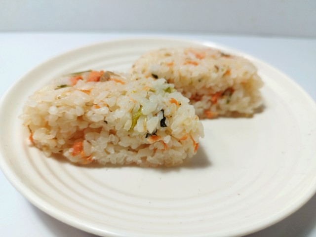 ご飯には鮭のほぐし身と小松菜、ごまが混ぜ込まれています。