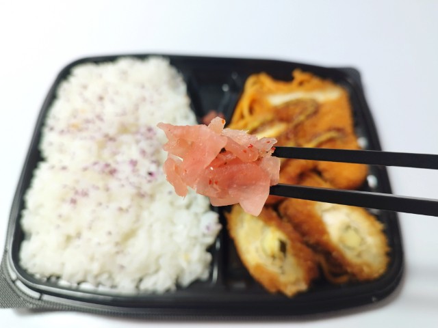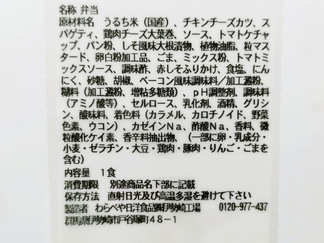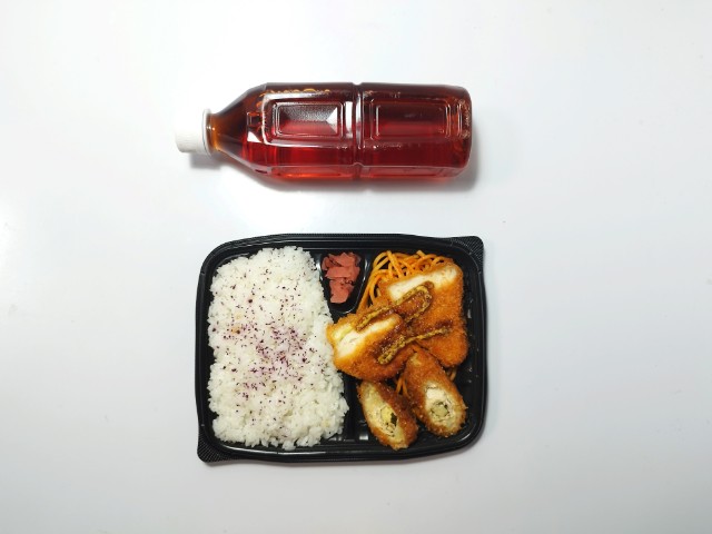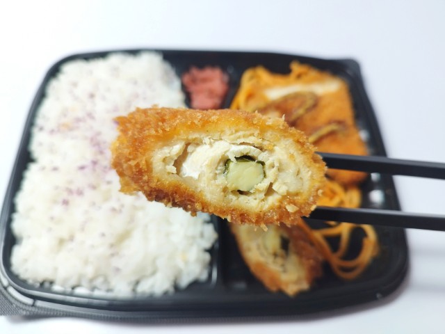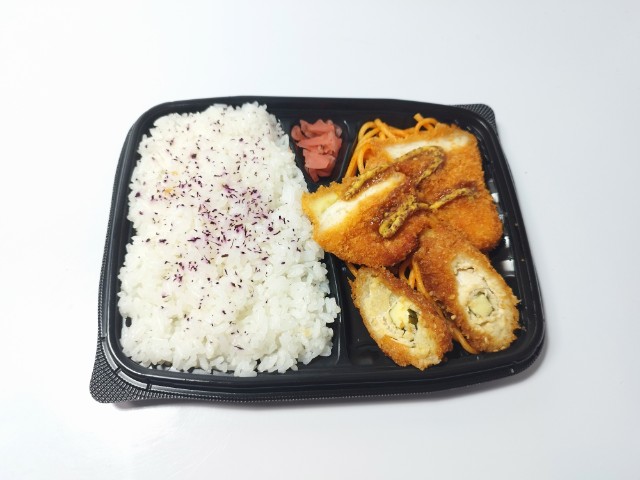 2種類のチーズチキンカツがのったお弁当です。商品名とその見た目に惹かれて買ってみました。そんな2種盛りチーズチキンカツ弁当ですが、チーズチキンカツは鶏の旨味と大葉の風味、チーズの塩味で、間違いのない美味しさです。ささみチーズカツはささみのしっとりとした肉質とチーズの味わいで、ご飯が進む一品になっています。ポイントはソースと共にチキンカツにかかっているマスタードで、マスタードの風味がチキンカツの美味しさをより引き立てています。他にもスパゲティや大根漬といった箸休めもあって、最後のひと口まで飽きることなく食べられます。内容量は1食分にちょうどよく、お腹も満たされます。ぜひ2種盛りチーズチキンカツ弁当を食べてみてください。