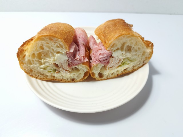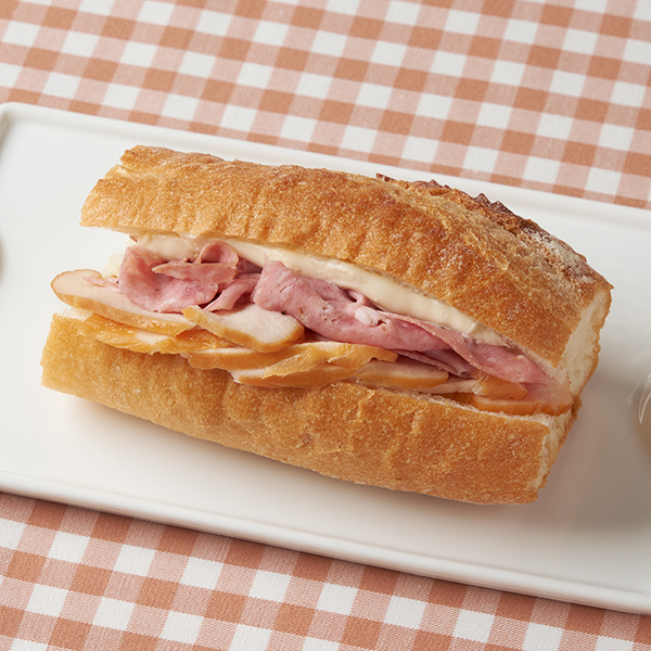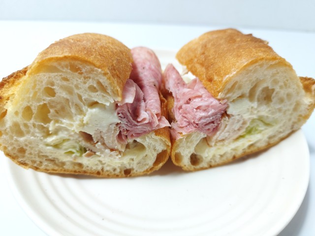 石窯で焼いたパリジャンに、スモークチキン、ソフトサラミ、レタス、シーザーマヨソース、クリームチーズなどを挟んだ、食べごたえのあるサンドです。