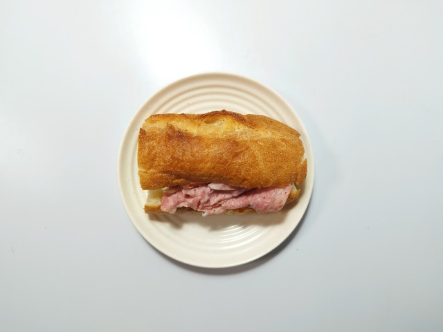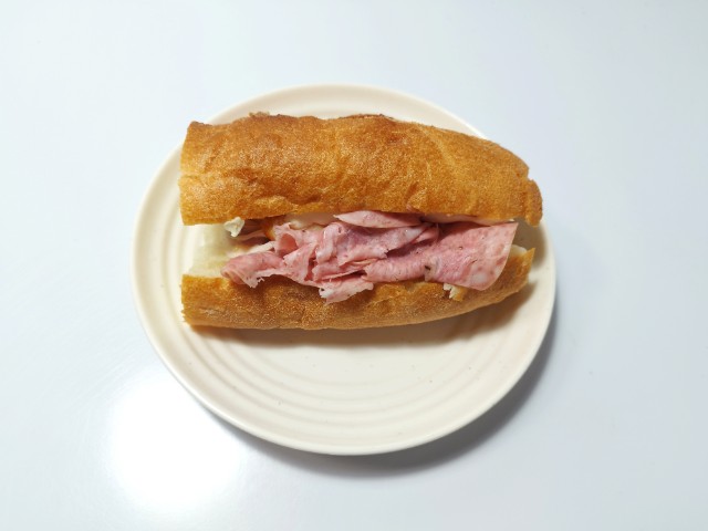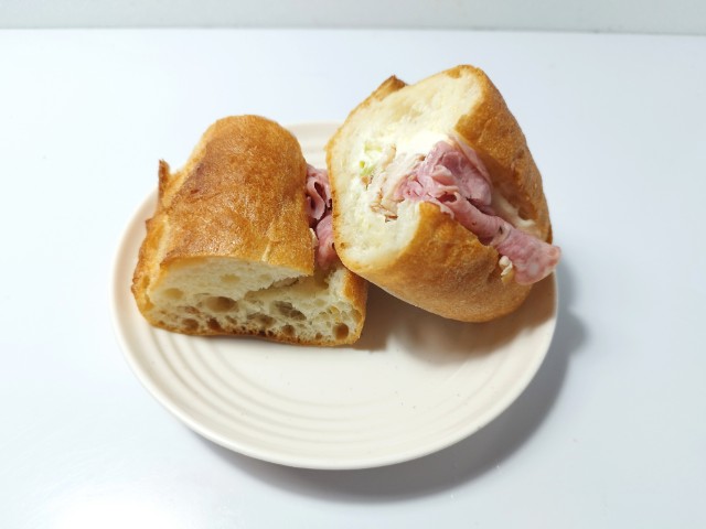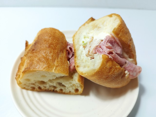 スモークチキンとソフトサラミを挟んだ石窯パンです。石窯パリジャンサンドも色々な種類が出てきていますが、今回はスモークチキンとソフトサラミになっています。そんな石窯パリジャンサンドですが、パン生地は外はしっかり、中はふっくらとした食感で歯切れが良く、食べ応えがあります。具材にはスモークチキンは鶏の旨味と香ばしい風味、ソフトサラミはしっとりとした食感とほのかな塩味があって、それぞれのバランスも良いです。ポイントはクリームチーズとシーザーマヨネーズで、クリームチーズのなめらかな味わいとシーザーマヨネーズのほどよい酸味が食材の美味しさをさらに引き立てています。小腹が空いた時や朝食で食べるのにちょうどよく、お腹も軽く満たされます。ぜひスモークチキン&ソフトサラミの石窯パリジャンサンドを食べてみてください。
