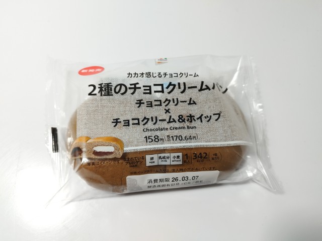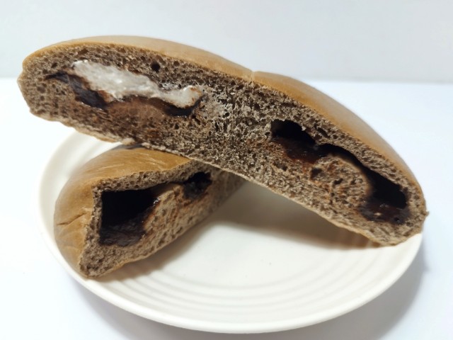 チョコクリームとホイップクリームが入ったチョコクリームパンです。以前に7プレミアム 2種のジャムパン(2025年11月18日発売)や7プレミアム 2種のクリームパン(2025年11月11日発売)がありましたが、今回はチョコクリームパンになっています。そんな2種のチョコクリームパンですが、生地はふんわりとした食感とココアの風味で、安定の美味しさです。チョコクリームはとろりとした食感とチョコの甘味、ホイップクリームはなめらかな食感とミルクの風味で、生地とのバランスも良いです。個数としては1個ですが、真ん中にくぼみがついているので、ちぎって2個のチョコクリームパンとして楽しむというのが正解なんだと思います。一人でも普通に食べ切れますし、シェアするにもピッタリです。ぜひ2種のチョコクリームパンを食べてみてください。