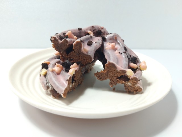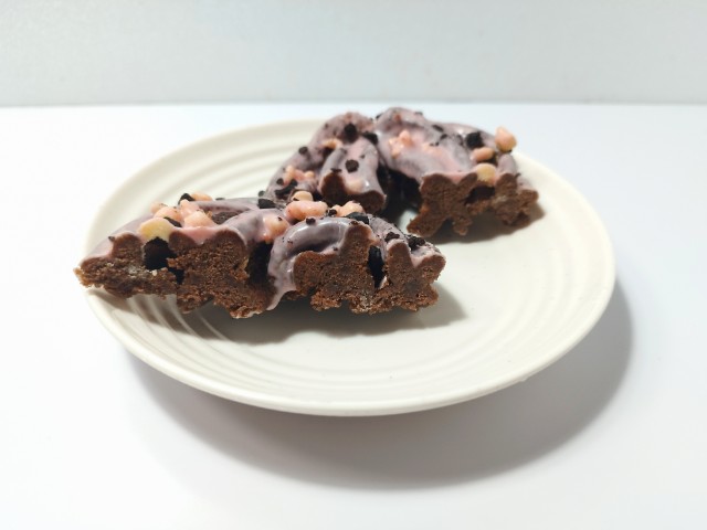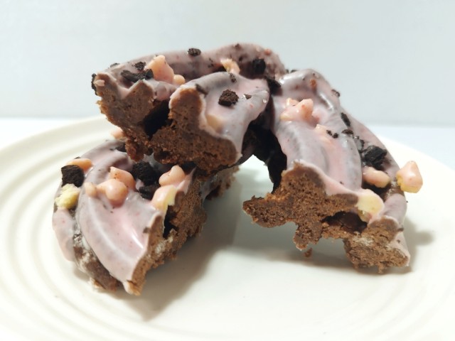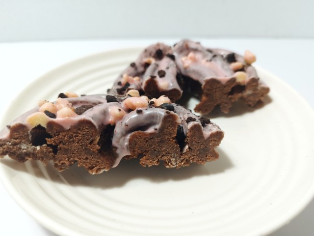 ブラックサンダーのクッキードーナツです。ファミリーマートでは3月4日から昨年に続き、今年も衝撃ザクザク食感!大人気「ブラックサンダー」コラボフェアを開催していて、今回の商品もその対象商品の一つになっています。そんなクッキードーナツですが、生地はザクザクとした食感とココアの風味で、安定の美味しさです。生地の上にはバタービスケット、いちごチョココーティング、ココアビスケットがトッピングされていて、バタービスケットはサクサクとした食感とバターの風味、いちごチョココーティングはいちごのほのかな酸味とチョコの甘味、ココアビスケットはバタービスケット同様にサクサクとした食感とココアの味わいで、それぞれ味や食感のアクセントになっています。ドーナツというよりもチョコ菓子のような味わいと食感で、最後のひと口まで美味しく食べられます。大きさは普通の菓子パンサイズくらいで、おやつや小腹が空いた時にピッタリです。ぜひピンクなブラックサンダークッキードーナツを食べてみてください。