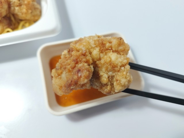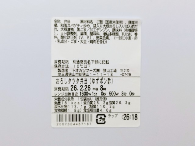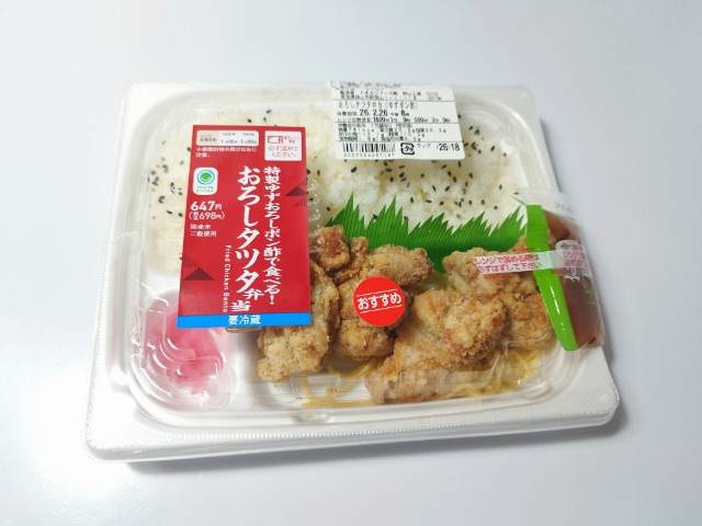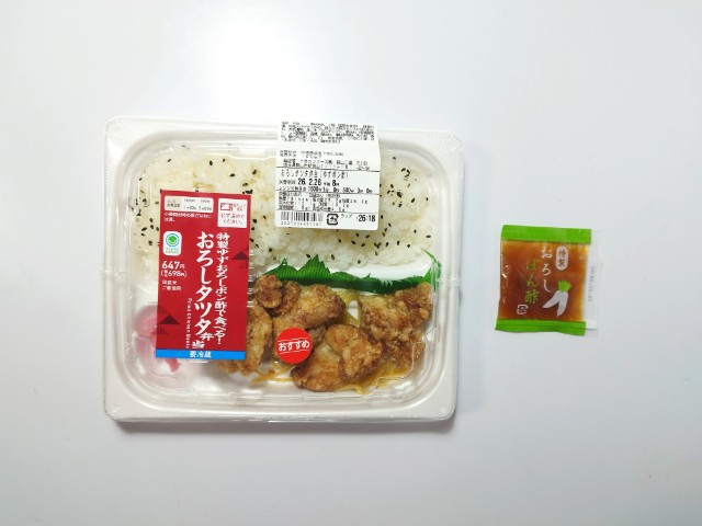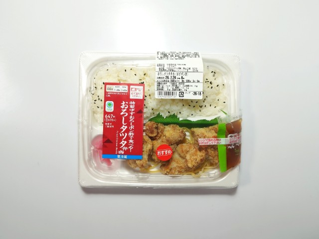 タツタ揚げお弁当です。同様の商品として、コンスタントに販売されているおろしタツタ弁当(2025年12月9日発売)がありますが、今回はチルド弁当になっているという事で、別のお弁当として扱っています。そんなおろしタツタ弁当ですが、タツタ揚げ鶏の旨味ジューシーな肉質で、美味しいのひと言です。ゆずおろしポン酢ゆずの香りほどよい酸味で、後味がさっぱりとしていて、タツタ揚げとの相性抜群です。他にもスパゲティ大根漬といった箸休めもあって、最後のひと口まで飽きることなく食べられます。内容量は1食分にちょうどよく、お腹も満たされます。ぜひ特製ゆずおろしポン酢で食べる!おろしタツタ弁当を食べてみてください。