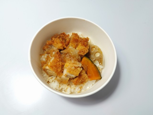 チキンカツをかつおや昆布だしがきいた醤油ベースのタレで食べるチキンカツごはんです。