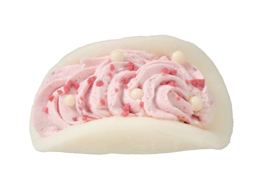 もちっと食感の白いどら焼生地で、甘酸っぱい果肉入りのいちごソースと程よい甘さのいちごミルクホイップを挟み、食感のアクセントとなるいちごチップキャンディとシリアルチョコを盛り付けた商品です。