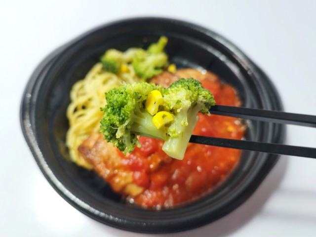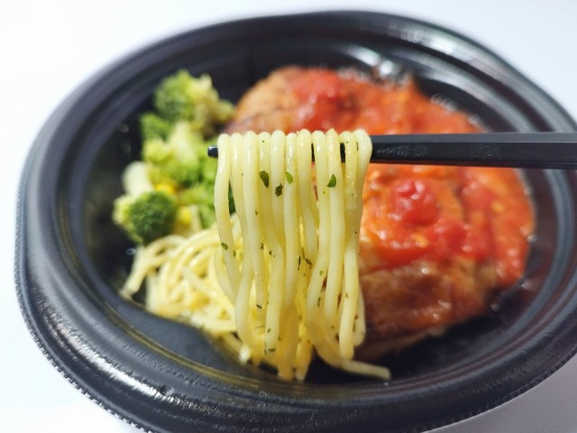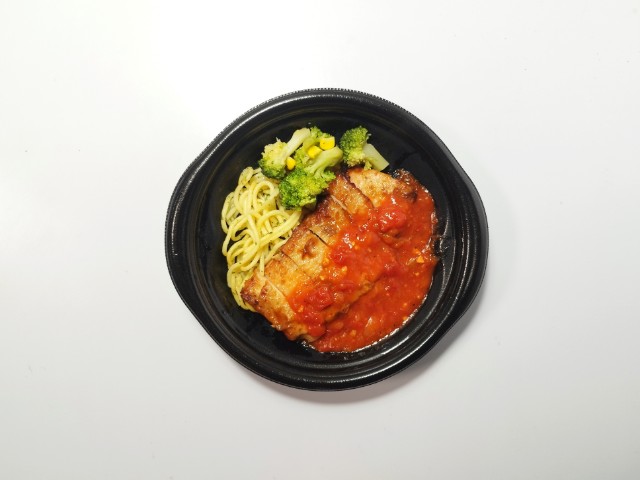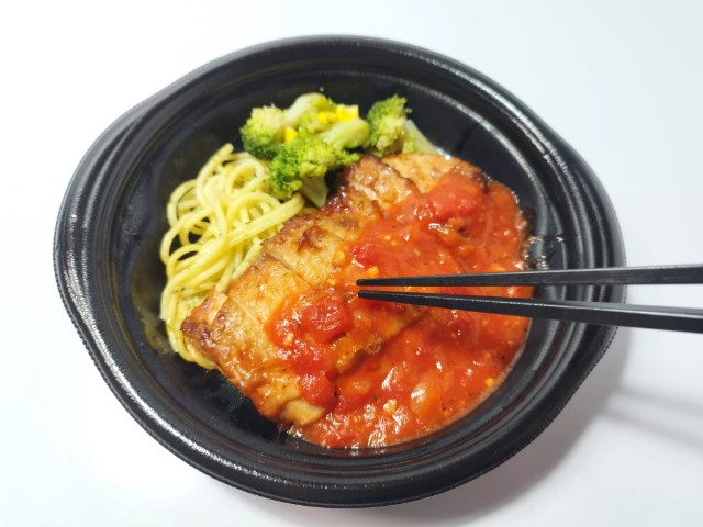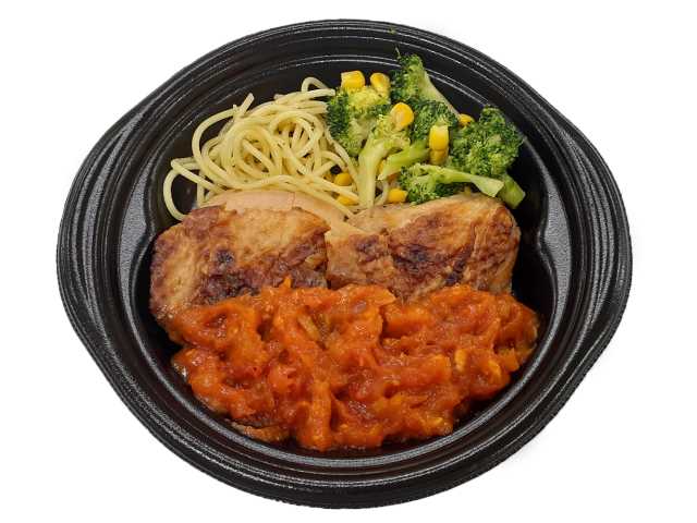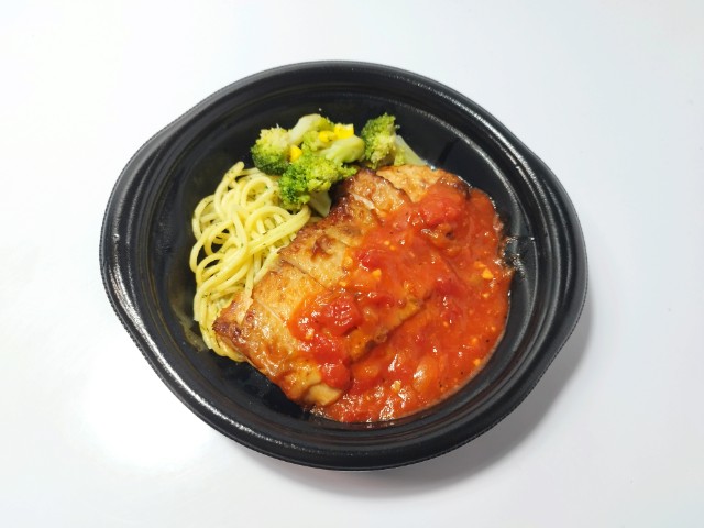 ガーリックトマトソースがかかったチキンステーキです。鮮やかな見た目に惹かれて買ってみました。そんなグリルチキンですが、鶏もも肉は弾力のある肉質とジューシーな味わいで、間違いのない美味しさです。ガーリックトマトソースはトマトの酸味とにんにくの味わいがあって、鶏肉との相性抜群です。他にもスパゲティやブロッコリー、コーンなども入っていて、ガーリックトマトソースともよく合います。この商品のポイントはやはりガーリックトマトソースで、万能ソースとはいかないまでも肉や野菜、魚、パスタなど色々と使えそうで、今回の鶏肉においても美味しく仕上がっています。内容量は一人分にちょうどよく、ご飯のおかずやお酒のお供にピッタリです。ぜひガーリックトマトソースのグリルチキンを食べてみてください。