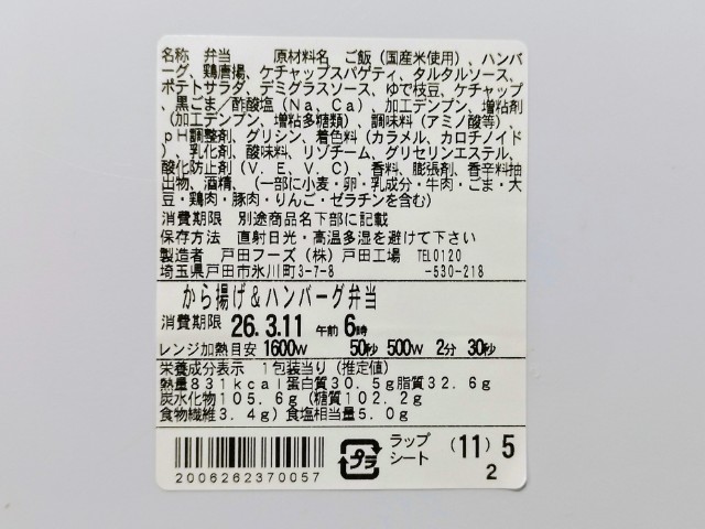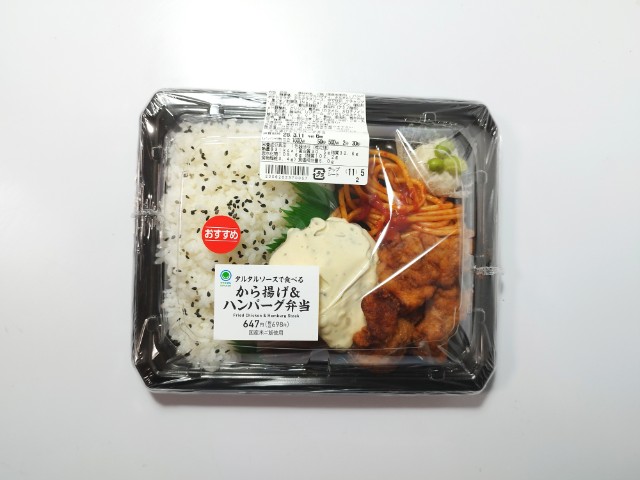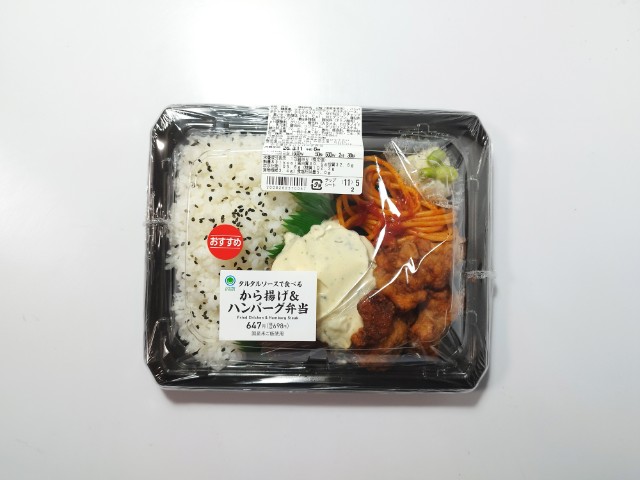 ファミリーマートの今週の新商品「タルタルソースで食べるから揚げ&ハンバーグ弁当」を食べてみました。