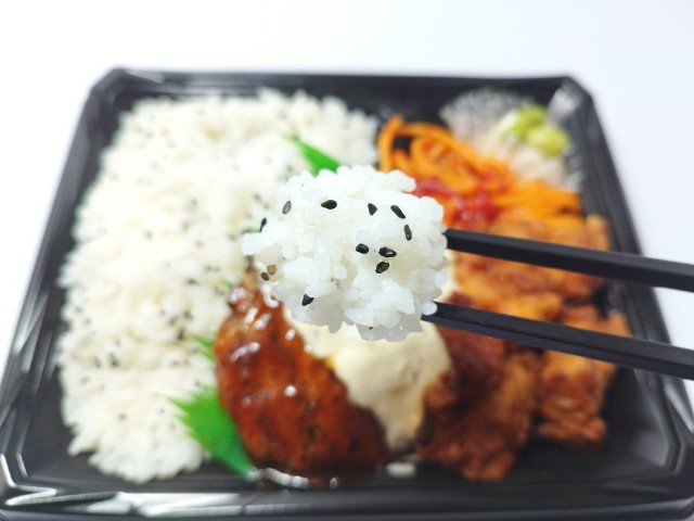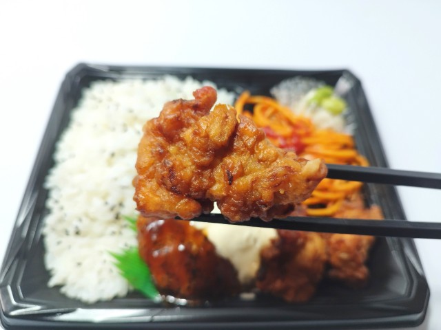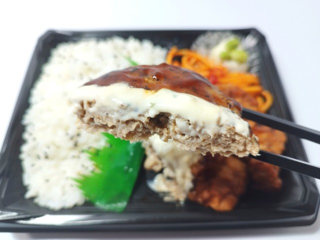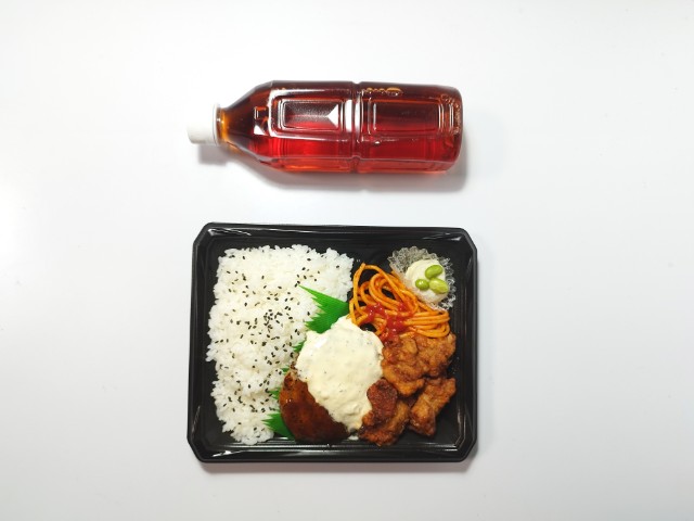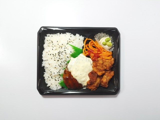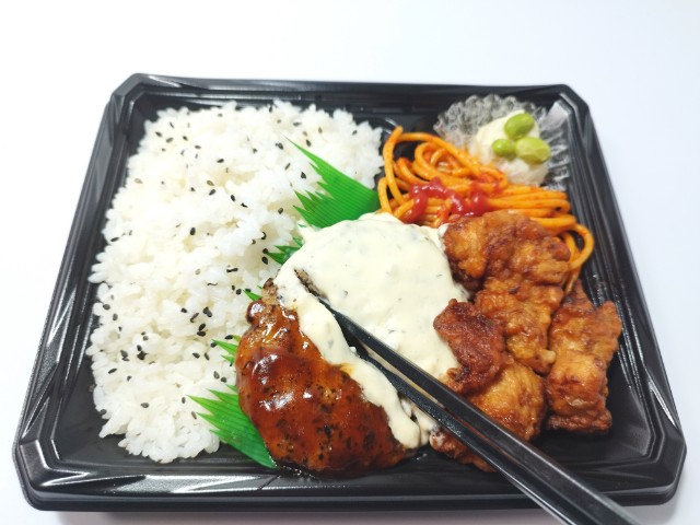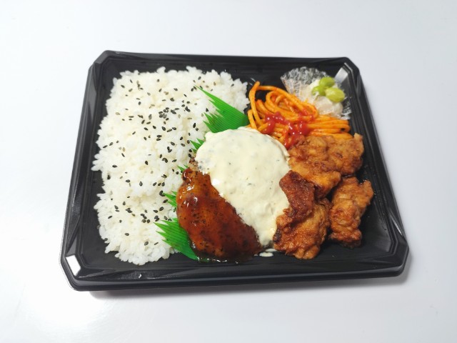 ハンバーグとから揚げに特製タルタルソースをトッピングしたボリューム感のあるお弁当です。
