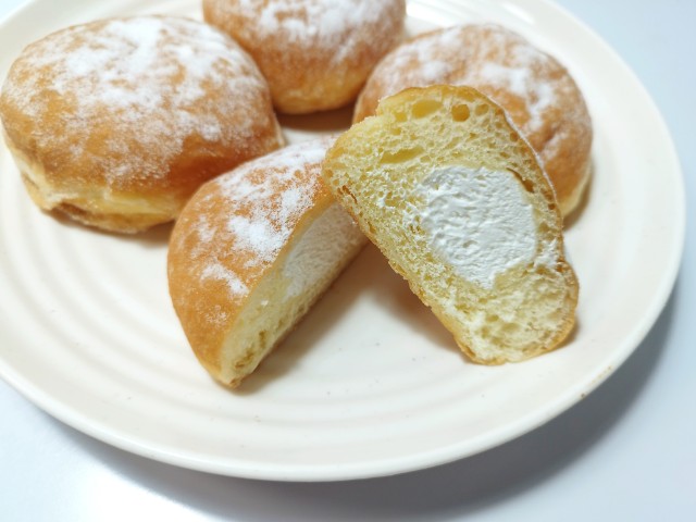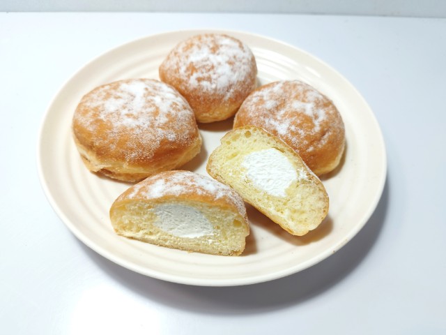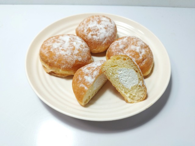 ホイップクリームが入ったドーナツです。以前にカスタードクリームドーナツ4個入(2025年12月23日発売)がありましたが、今回はホイップクリームになっています。そんなホイップクリームドーナツですが、生地ふんわりとした食感くちどけの良さ粉糖の甘味で、間違いのない美味しさです。中にはホイップクリームが入っていて、なめらかな食感ミルクの風味で、生地ともよく合います。ドーナツではありますが、油のしつこさがないのがポイントで、見た目以上に軽く食べられます。4個入ですが、1個ふた口サイズくらいなので、一人でも普通に食べ切れます。もちろんシェアするにもピッタリです。ぜひホイップクリームドーナツを食べてみてください。