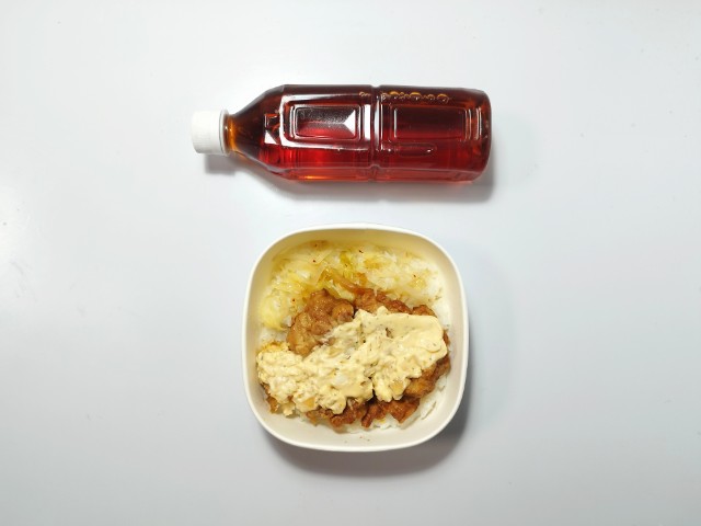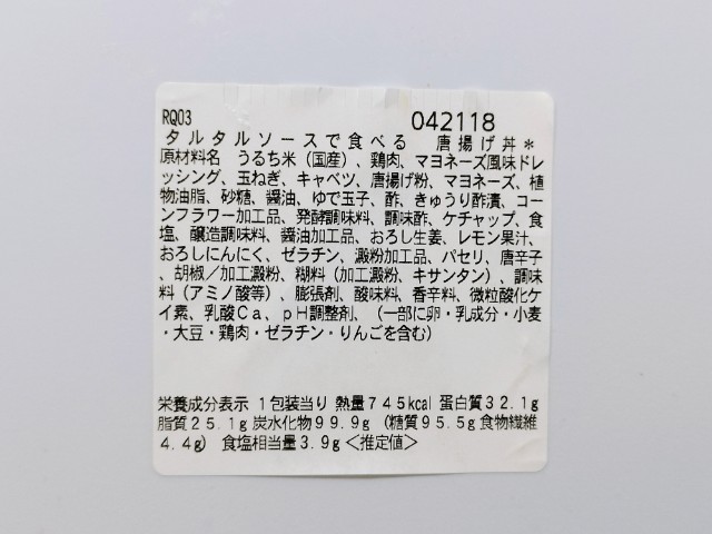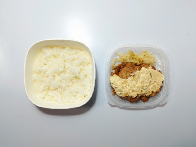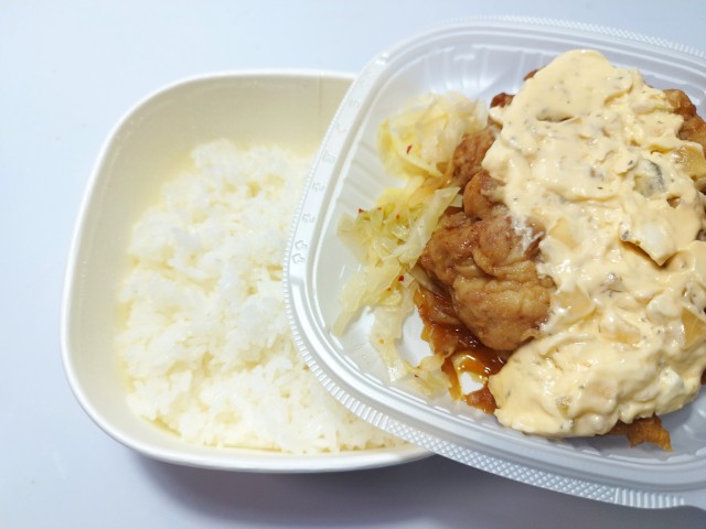 タルタルソースで食べる唐揚げ丼です。商品名そのままですが、タルタルソースと唐揚げという間違いのない組み合わせに惹かれて買ってみました。そんな唐揚げ丼ですが、唐揚げは鶏の旨味と弾力のある肉質、ジューシーな味わいで、美味しいのひと言です。また、個体差があるので、もしかしたらお弁当によっては数が違うかもしれませんが、今回のお弁当では大きな唐揚げが4個入っていました。タルタルソースはたまごのコクとマヨネーズのなめらかな味わい、玉ねぎの食感があって、唐揚げとの相性抜群です。他にもキャベツものっていて、こちらは箸休めにピッタリです。内容量は1食分にちょうどよく、お腹も満たされます。ぜひタルタルソースで食べる唐揚げ丼を食べてみてください。