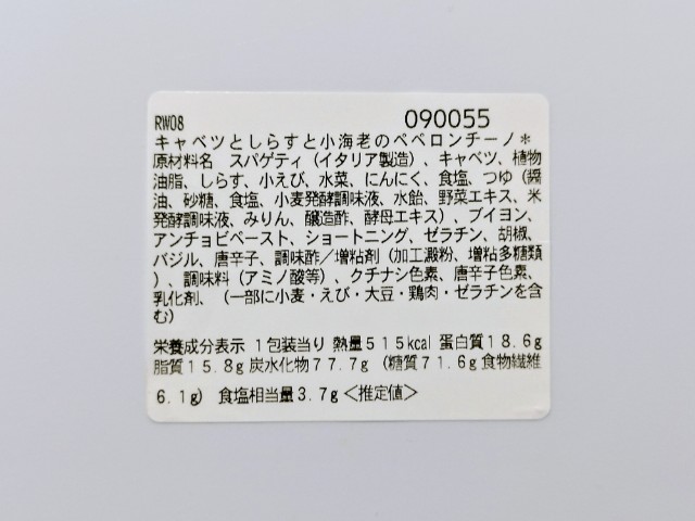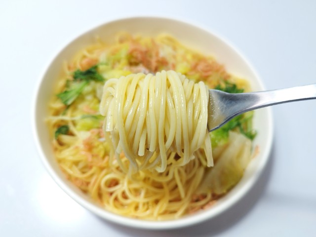 キャベツとしらす、小海老などがのったペペロンチーノです。見つけた瞬間に手に取ってしまった商品で、個人的には楽しみにしていた新商品の一つでもあります。そんなキャベツとしらすと小海老のペペロンチーノですが、にんにくの風味とオリーブオイルの味わい、唐辛子のピリッとした辛味があって、間違いのない美味しさです。パスタはほどよい硬さと小麦の風味で、どんどんと食べ進められます。具材にはキャベツとしらす、小海老、水菜などがのっていて、キャベツはしんなりとした食感とキャベツの甘味、しらすはしらすの旨味とほのかな塩味、小海老は海老の風味と香ばしい味わい、水菜はシャキシャキとした食感とそれぞれの食感を楽しめると共に味のバランスも良いです。内容量は1食分にちょうどよく、お腹も満たされます。ぜひキャベツとしらすと小海老のペペロンチーノを食べてみてください。