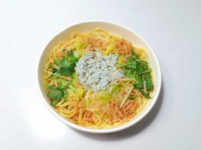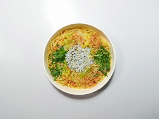 キャベツ,しらす,小海老,水菜を盛りつけたペペロンチーノです。