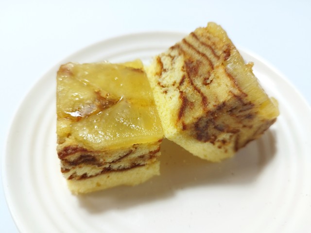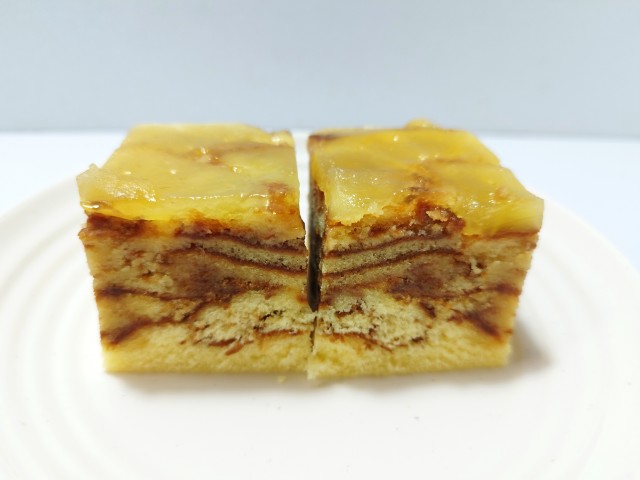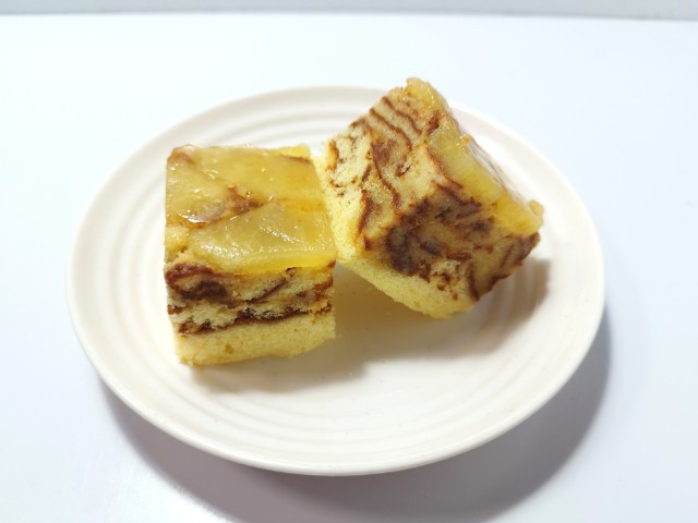 上からりんごのシロップ漬け、ケーキ生地、スポンジ生地の層になっています。